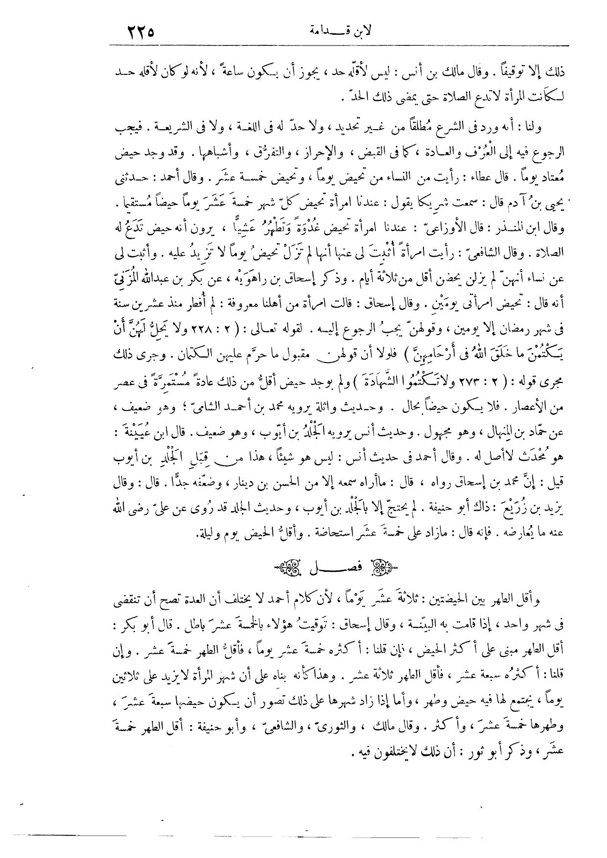 (٤٤٨) فَصْلٌ: وَأَقَلُّ الطُّهْرِ بَيْنَ الْحَيْضَتَيْنِ ثَلَاثَةَ عَشَرَ يَوْمًا؛ لِأَنَّ كَلَامَ أَحْمَدَ لَا يَخْتَلِفُ أَنَّ الْعِدَّةَ تَصِحُّ أَنْ تَنْقَضِيَ فِي شَهْرٍ وَاحِدٍ إذَا قَامَتْ بِهِ الْبَيِّنَةُ. وَقَالَ إِسْحَاقُ: تَوْقِيتُ هَؤُلَاءِ بِالْخَمْسَةِ عَشَرَ بَاطِلٌ. وَقَالَ أَبُو بَكْرٍ: أَقَلُّ الطُّهْرِ مَبْنِيٌّ عَلَى أَكْثَرِ الْحَيْضِ، فَإِنْ قُلْنَا أَكْثَرُهُ خَمْسَةَ عَشَرَ يَوْمًا، فَأَقَلُّ الطُّهْرِ خَمْسَةَ عَشَرَ، وَإِنْ قُلْنَا أَكْثَرُهُ سَبْعَةَ عَشَرَ، فَأَقَلُّ الطُّهْرِ ثَلَاثَةَ عَشَرَ. وَهَذَا كَأَنَّهُ بَنَاهُ عَلَى أَنَّ شَهْرَ الْمَرْأَةِ لَا يَزِيدُ عَلَى ثَلَاثِينَ يَوْمًا، يَجْتَمِعُ لَهَا فِيهِ حَيْضٌ وَطُهْرٌ، وَأَمَّا إذَا زَادَ شَهْرُهَا عَلَى ذَلِكَ تَصَوَّرَ أَنْ يَكُونَ حَيْضُهَا سَبْعَةَ عَشَرَ، وَطُهْرُهَا خَمْسَةَ عَشَرَ وَأَكْثَرَ.