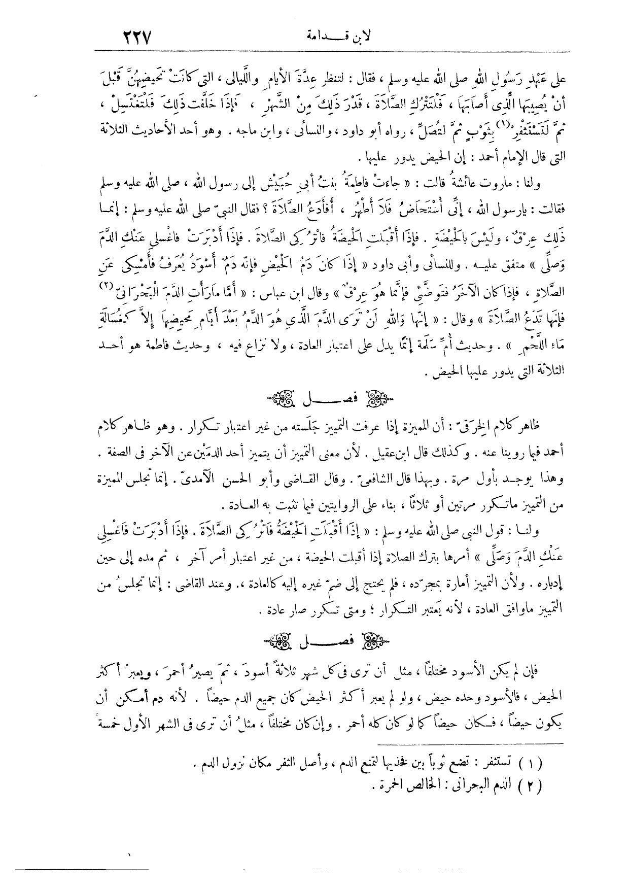 عَلَى عَهْدِ رَسُولِ اللَّهِ - صَلَّى اللَّهُ عَلَيْهِ وَسَلَّمَ - فَقَالَ: لِتَنْظُرْ عِدَّةَ الْأَيَّامِ وَاللَّيَالِي الَّتِي كَانَتْ تَحِيضُهُنَّ قَبْلَ أَنْ يُصِيبَهَا الَّذِي أَصَابَهَا، فَلْتَتْرُكْ الصَّلَاةَ قَدْرَ ذَلِكَ مِنْ الشَّهْرِ، فَإِذَا خَلَّفَتْ ذَلِكَ فَلْتَغْتَسِلْ، ثُمَّ لِتَسْتَثْفِرْ بِثَوْبٍ ثُمَّ لِتُصَلِّ» . رَوَاهُ أَبُو دَاوُد، وَالنَّسَائِيُّ، وَابْنُ مَاجَهْ. وَهُوَ أَحَدُ الْأَحَادِيثِ الثَّلَاثَةِ الَّتِي قَالَ الْإِمَامُ أَحْمَدُ: إنَّ الْحَيْضَ يَدُورُ عَلَيْهَا.