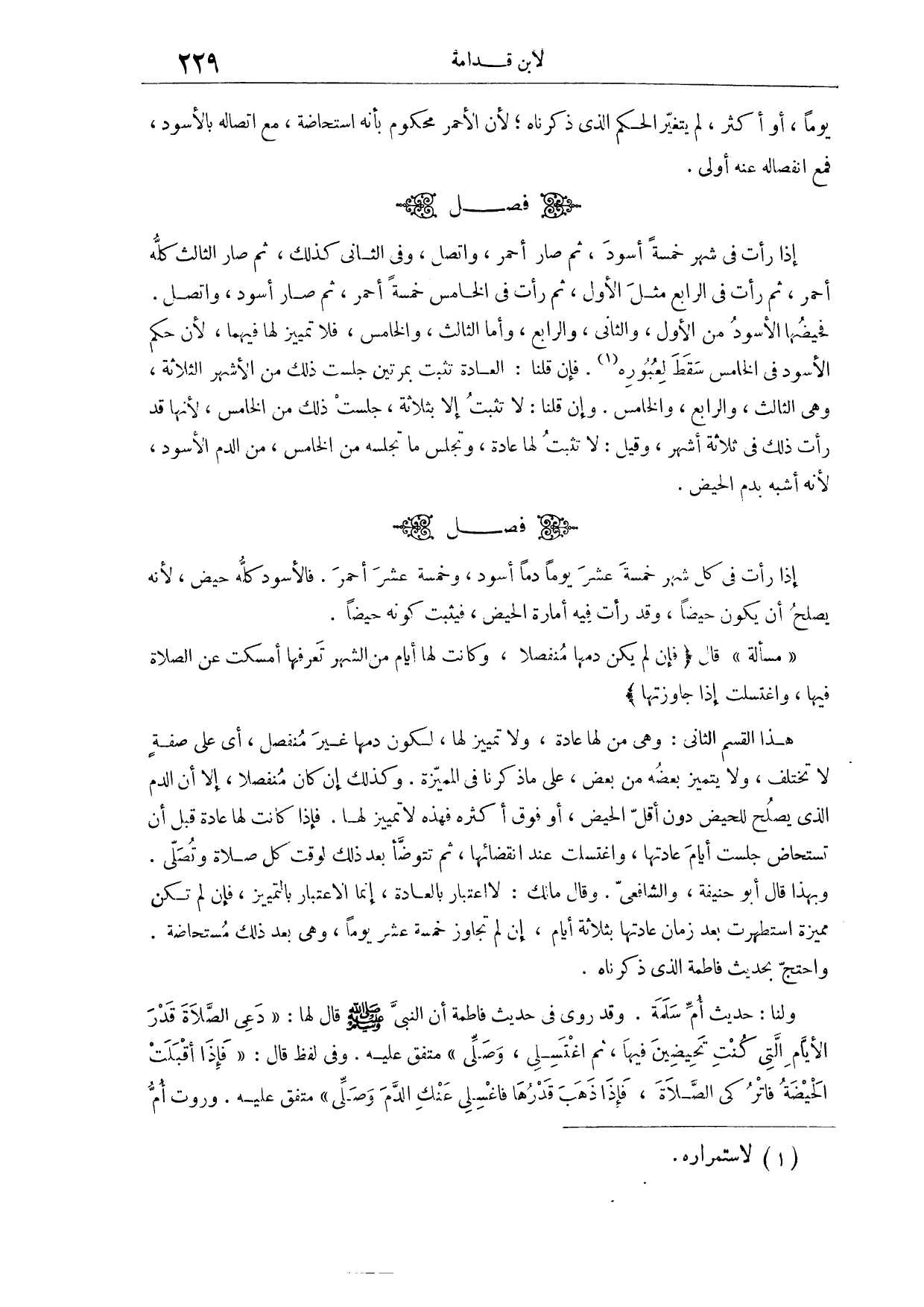 (٤٥٤) فَصْلٌ: إذَا رَأَتْ فِي كُلِّ شَهْرٍ خَمْسَةَ عَشَرَ يَوْمًا دَمًا أَسْوَدَ، وَخَمْسَةَ عَشَرَ أَحْمَرَ، فَالْأَسْوَدُ كُلُّهُ حَيْضٌ؛ لِأَنَّهُ يَصْلُحُ أَنْ يَكُونَ حَيْضًا، وَقَدْ رَأَتْ فِيهِ أَمَارَةَ الْحَيْضِ، فَيَثْبُتُ كَوْنُهُ حَيْضًا.