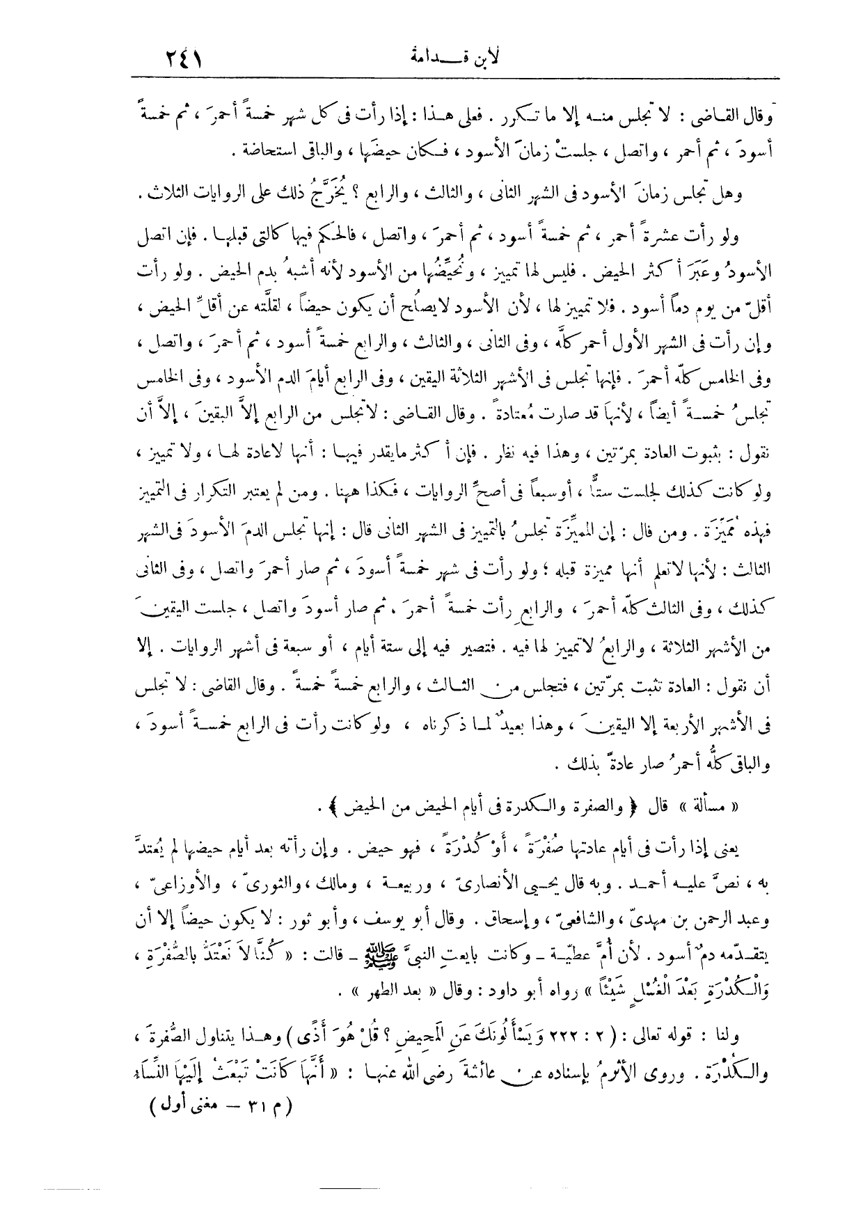 (٤٧٥) مَسْأَلَةٌ: قَالَ: (وَالصُّفْرَةُ وَالْكُدْرَةُ فِي أَيَّامِ الْحَيْضِ مِنْ الْحَيْضِ) يَعْنِي إذَا رَأَتْ فِي أَيَّامِ عَادَتِهَا صُفْرَةً أَوْ كُدْرَةً، فَهُوَ حَيْضٌ، وَإِنْ رَأَتْهُ بَعْدَ أَيَّامِ حَيْضِهَا، لَمْ يُعْتَدَّ بِهِ. نَصَّ عَلَيْهِ أَحْمَدُ. وَبِهِ قَالَ يَحْيَى الْأَنْصَارِيُّ، وَرَبِيعَةُ، وَمَالِكٌ، وَالثَّوْرِيُّ، وَالْأَوْزَاعِيُّ، وَعَبْدُ الرَّحْمَنِ بْنُ مَهْدِيٍّ، وَالشَّافِعِيُّ، وَإِسْحَاقُ. وَقَالَ أَبُو يُوسُفَ، وَأَبُو ثَوْرٍ: لَا يَكُونُ حَيْضًا، إلَّا أَنْ يَتَقَدَّمَهُ دَمٌ أَسْوَدُ؛ لِأَنَّ أُمَّ عَطِيَّةَ، وَكَانَتْ بَايَعَتْ النَّبِيَّ - صَلَّى اللَّهُ عَلَيْهِ وَسَلَّمَ - قَالَتْ: كُنَّا لَا نَعْتَدُّ بِالصُّفْرَةِ وَالْكُدْرَةِ بَعْدَ الْغُسْلِ شَيْئًا. رَوَاهُ أَبُو دَاوُد، وَقَالَ: بَعْدَ الطُّهْرِ.