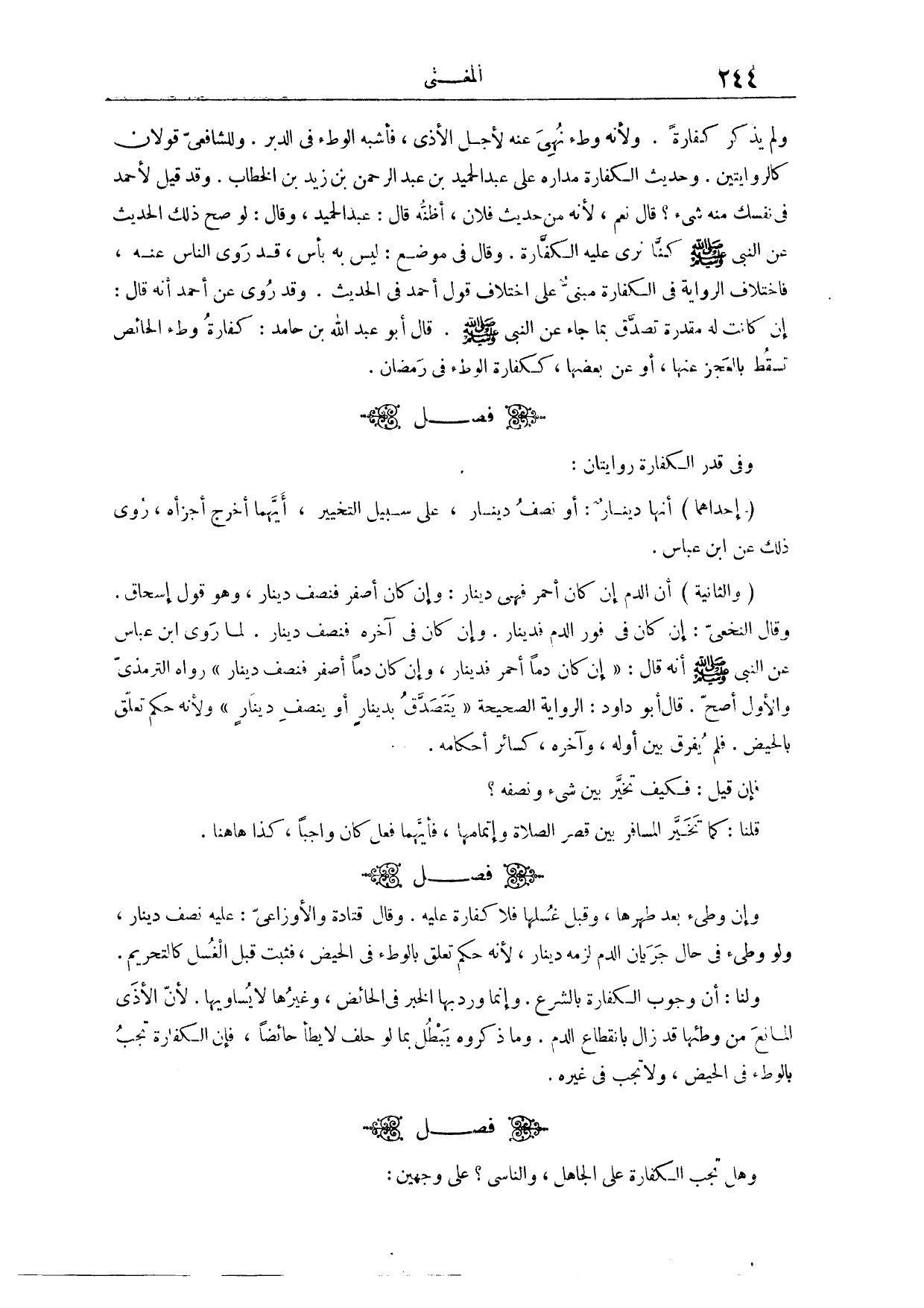 (٤٧٩) فَصْلٌ: وَفِي قَدْرِ الْكَفَّارَةِ رِوَايَتَانِ: إحْدَاهُمَا، أَنَّهَا دِينَارٌ، أَوْ نِصْفُ دِينَارٍ، عَلَى سَبِيلِ التَّخْيِيرِ، أَيَّهُمَا أَخْرَجَ أَجْزَأَهُ، رُوِيَ ذَلِكَ عَنْ ابْنِ عَبَّاسٍ، وَالثَّانِيَةُ، أَنَّ الدَّمَ إنْ كَانَ أَحْمَرَ فَهِيَ دِينَارٌ، وَإِنْ كَانَ أَصْفَرَ، فَنِصْفُ دِينَارٍ.