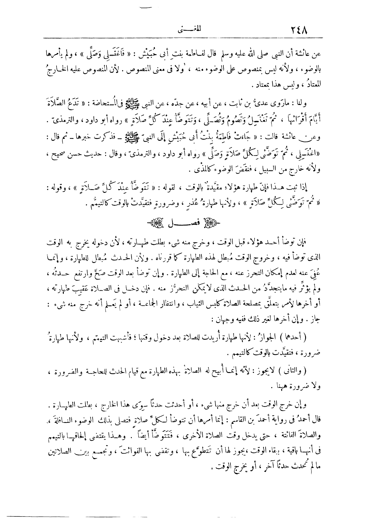 ، وَعَنْ عَائِشَةَ، قَالَتْ: «جَاءَتْ فَاطِمَةُ بِنْتُ أَبِي حُبَيْشٍ إلَى النَّبِيِّ - صَلَّى اللَّهُ عَلَيْهِ وَسَلَّمَ - فَذَكَرَتْ خَبَرَهَا، ثُمَّ قَالَ: اغْتَسِلِي، ثُمَّ تَوَضَّئِي لِكُلِّ صَلَاةٍ وَصَلِّي» . رَوَاهُ أَبُو دَاوُد، وَالتِّرْمِذِيُّ، وَقَالَ: حَدِيثٌ حَسَنٌ صَحِيحٌ. وَلِأَنَّهُ خَارِجٌ مِنْ السَّبِيلِ، فَنَقَضَ الْوُضُوءَ، كَالْمَذْيِ. إذَا ثَبَتَ هَذَا، فَإِنَّ طَهَارَةَ هَؤُلَاءِ مُقَيَّدَةٌ بِالْوَقْتِ؛ لِقَوْلِهِ: " تَتَوَضَّأُ عِنْدَ كُلِّ صَلَاةٍ ". وَقَوْلِهِ: " ثُمَّ تَوَضَّئِي لِكُلِّ صَلَاةٍ ". وَلِأَنَّهَا طَهَارَةُ عُذْرٍ وَضَرُورَةٍ، فَتَقَيَّدَتْ بِالْوَقْتِ، كَالتَّيَمُّمِ.