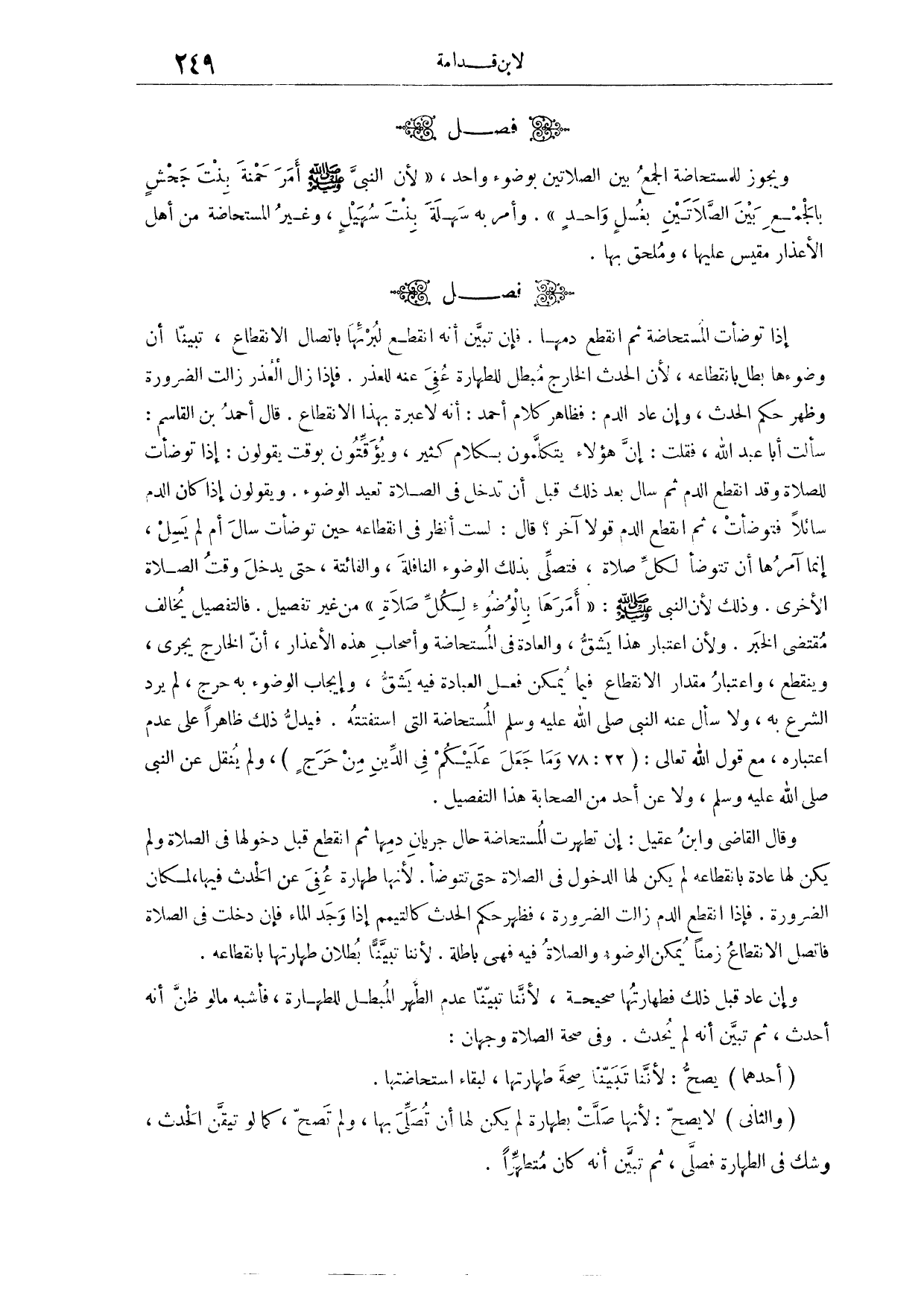 (٤٨٩) فَصْلٌ: وَيَجُوزُ لِلْمُسْتَحَاضَةِ الْجَمْعُ بَيْنَ الصَّلَاتَيْنِ بِوُضُوءٍ وَاحِدٍ؛ لِأَنَّ «النَّبِيَّ - صَلَّى اللَّهُ عَلَيْهِ وَسَلَّمَ - أَمَرَ حَمْنَةَ بِنْتَ جَحْشٍ بِالْجَمْعِ بَيْنَ الصَّلَاتَيْنِ بِغُسْلٍ وَاحِدٍ، وَأَمَرَ بِهِ سَهْلَةَ بِنْتَ سُهَيْلٍ» وَغَيْرُ الْمُسْتَحَاضَةِ مِنْ أَهْلِ الْأَعْذَارِ مَقِيسٌ عَلَيْهَا، وَمُلْحَقٌ بِهَا.