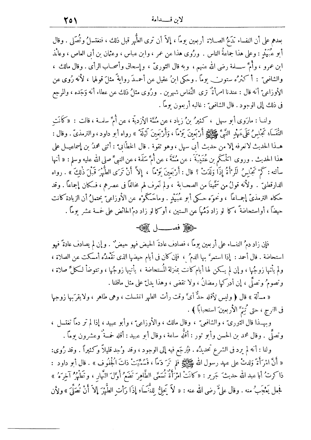 بَعْدَهُمْ عَلَى أَنَّ النُّفَسَاءَ تَدَعُ الصَّلَاةَ أَرْبَعِينَ يَوْمًا إلَّا أَنْ تَرَى الطُّهْرَ قَبْلَ ذَلِكَ، فَتَغْتَسِلَ وَتُصَلِّيَ. وَقَالَ أَبُو عُبَيْدٍ: وَعَلَى هَذَا جَمَاعَةُ النَّاسِ، وَرُوِيَ هَذَا عَنْ عُمَرَ، وَابْنِ عَبَّاسٍ، وَعُثْمَانَ بْنِ أَبِي الْعَاصِ، وَعَائِذِ بْنِ عَمْرٍو وَأَنَسٍ، وَأُمِّ سَلَمَةَ - رَضِيَ اللَّهُ عَنْهُمْ -. وَبِهِ قَالَ الثَّوْرِيُّ، وَإِسْحَاقُ، وَأَصْحَابُ الرَّأْيِ. وَقَالَ مَالِكٌ، وَالشَّافِعِيُّ: أَكْثَرُهُ سِتُّونَ يَوْمًا.