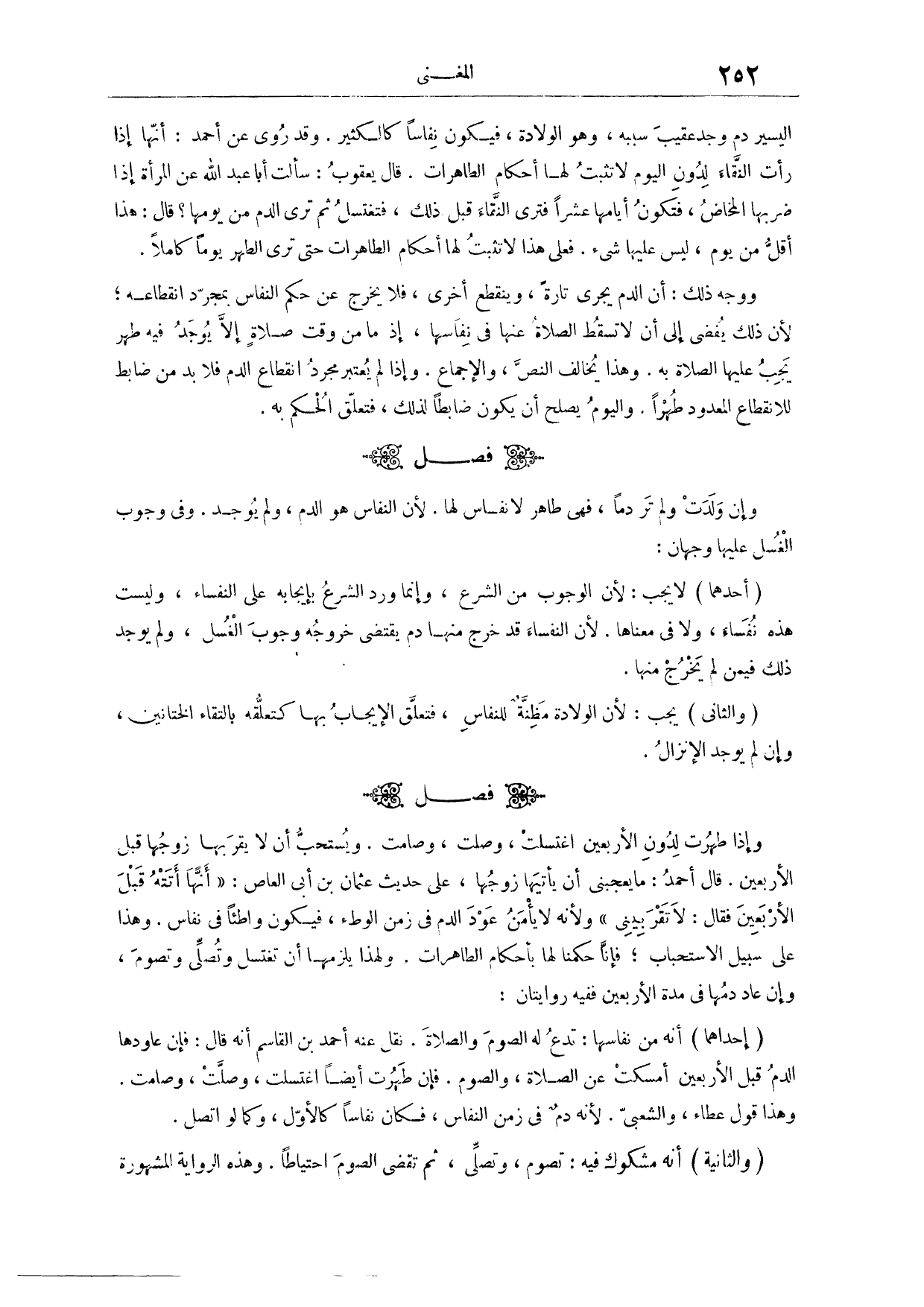 (٤٩٦) فَصْلٌ: وَإِذَا طَهُرَتْ لِدُونِ الْأَرْبَعِينَ اغْتَسَلَتْ وَصَلَّتْ، وَصَامَتْ، وَيُسْتَحَبُّ أَنْ لَا يَقْرَبَهَا زَوْجُهَا قَبْلَ الْأَرْبَعِينَ. قَالَ أَحْمَدُ: مَا يُعْجِبُنِي أَنْ يَأْتِيَهَا زَوْجُهَا، عَلَى حَدِيثِ عُثْمَانَ بْنِ أَبِي الْعَاصِ، أَنَّهَا أَتَتْهُ قَبْلَ الْأَرْبَعِينَ، فَقَالَ لَا تَقْرَبِينِي؛ وَلِأَنَّهُ لَا يَأْمَنُ عَوْدَ الدَّمِ فِي زَمَنِ الْوَطْءِ، فَيَكُونُ وَاطِئًا فِي نِفَاسٍ، وَهَذَا عَلَى سَبِيلِ الِاسْتِحْبَابِ، فَإِنَّا حَكَمْنَا لَهَا بِأَحْكَامِ الطَّاهِرَاتِ وَلِهَذَا يَلْزَمُهَا أَنْ تَغْتَسِلَ وَتُصَلِّيَ، وَتَصُومَ. وَإِنْ عَادَ دَمُهَا فِي مُدَّةِ الْأَرْبَعِينَ فَفِيهِ رِوَايَتَانِ.