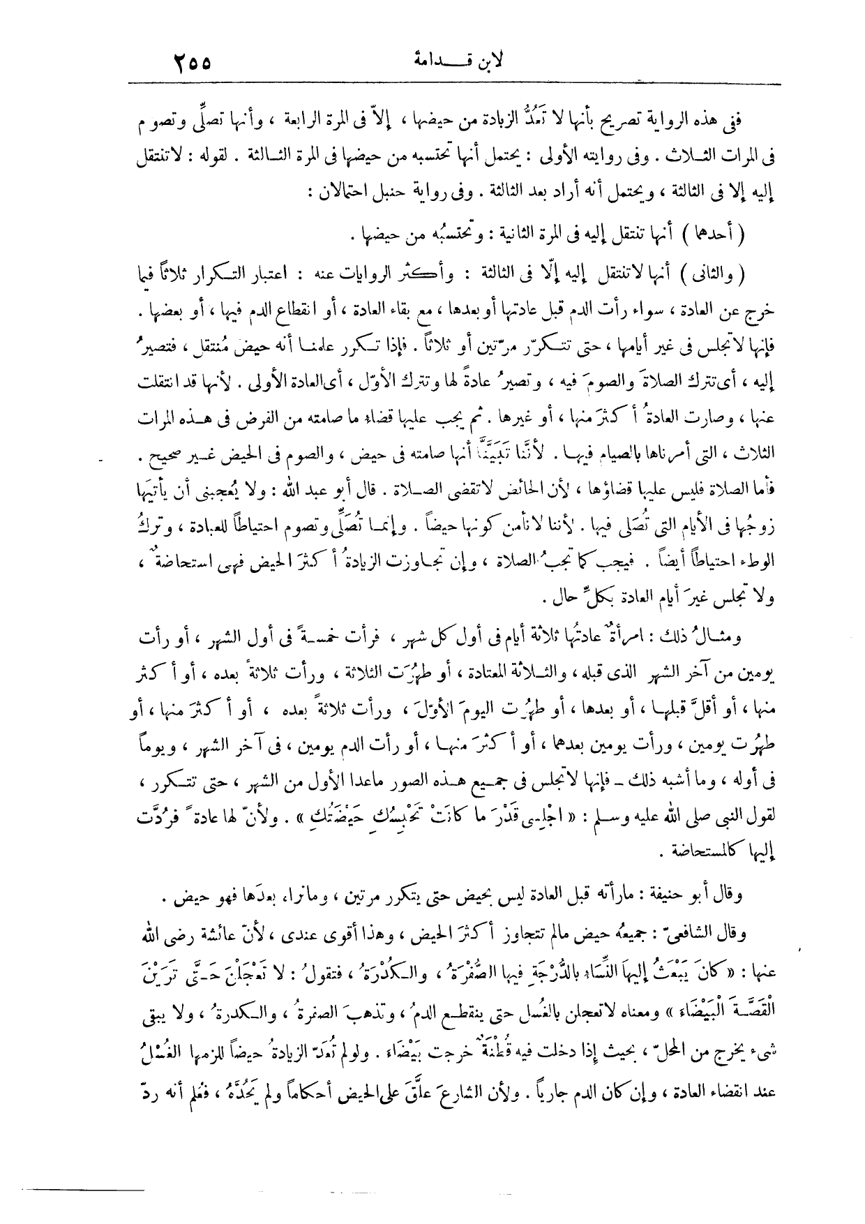 وَفِي رِوَايَتِهِ الْأُولَى يَحْتَمِلُ أَنَّهَا تَحْتَسِبُهُ مِنْ حَيْضِهَا فِي الْمَرَّةِ الثَّالِثَةِ؛ لِقَوْلِهِ: لَا تَنْتَقِلُ إلَيْهِ إلَّا فِي الثَّالِثَةِ، وَيَحْتَمِلُ أَنَّهُ أَرَادَ بَعْدَ الثَّالِثَةِ، وَفِي رِوَايَةِ حَنْبَلٍ احْتِمَالَانِ أَحَدُهُمَا، أَنَّهَا تَنْتَقِلُ إلَيْهِ فِي الْمَرَّةِ الثَّانِيَةِ، وَتَحْتَسِبُهُ مِنْ حَيْضِهَا. وَالثَّانِي، أَنَّهَا لَا تَنْتَقِلُ إلَيْهِ إلَّا فِي الثَّالِثَةِ. وَأَكْثَرُ الرِّوَايَاتِ عَنْهُ اعْتِبَارُ التَّكْرَارِ ثَلَاثًا فِيمَا خَرَجَ عَنْ الْعَادَةِ سَوَاءٌ رَأَتْ الدَّمَ قَبْلَ عَادَتِهَا، أَوْ بَعْدَهَا مَعَ بَقَاءِ الْعَادَةِ، أَوْ انْقِطَاعِ الدَّمِ فِيهَا، أَوْ فِي بَعْضِهَا، فَإِنَّهَا لَا تَجْلِسُ فِي غَيْرِ أَيَّامِهَا حَتَّى تَتَكَرَّرَ مَرَّتَيْنِ أَوْ ثَلَاثًا، فَإِذَا تَكَرَّرَ عَلِمْنَا أَنَّهُ حَيْضٌ مُنْتَقِلٌ، فَتَصِيرُ إلَيْهِ، أَيْ تَتْرُكُ الصَّلَاةَ وَالصَّوْمَ فِيهِ، وَتَصِيرُ عَادَةً لَهَا، وَتَتْرُكُ الْأَوَّلَ، أَيْ الْعَادَةَ الْأُولَى؛ لِأَنَّهَا قَدْ انْتَقَلَتْ عَنْهَا، وَصَارَتْ الْعَادَةُ أَكْثَرَ مِنْهَا أَوْ غَيْرِهَا.
