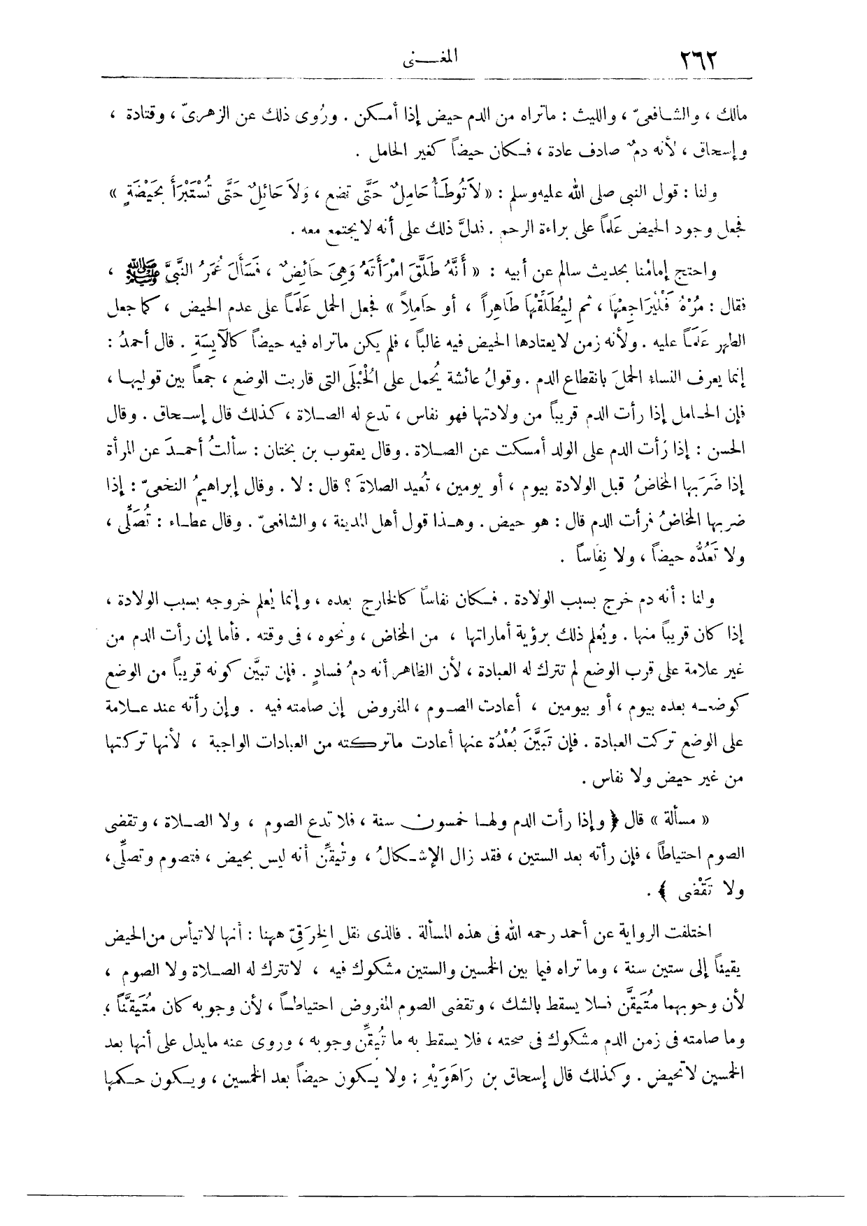 وَاحْتَجَّ إمَامُنَا بِحَدِيثِ سَالِمٍ عَنْ أَبِيهِ «أَنَّهُ طَلَّقَ امْرَأَتَهُ وَهِيَ حَائِضٌ، فَسَأَلَ عُمَرُ النَّبِيَّ - صَلَّى اللَّهُ عَلَيْهِ وَسَلَّمَ - فَقَالَ مُرْهُ فَلْيُرَاجِعْهَا، ثُمَّ لِيُطَلِّقْهَا طَاهِرًا أَوْ حَامِلًا» فَجَعَلَ الْحَمْلَ عَلَمًا عَلَى عَدَمِ الْحَيْضِ، كَمَا جَعَلَ الطُّهْرَ عَلَمًا عَلَيْهِ؛ وَلِأَنَّهُ زَمَنٌ لَا يَعْتَادُهَا الْحَيْضُ فِيهِ غَالِبًا، فَلَمْ يَكُنْ مَا تَرَاهُ فِيهِ حَيْضًا كَالْآيِسَةِ قَالَ أَحْمَدُ إنَّمَا يَعْرِفُ النِّسَاءُ الْحَمْلَ بِانْقِطَاعِ الدَّمِ، وَقَوْلُ عَائِشَةَ يُحْمَلُ عَلَى الْحُبْلَى الَّتِي قَارَبَتْ الْوَضْعَ، جَمْعًا بَيْنَ قَوْلَيْهَا، فَإِنَّ الْحَامِلَ إذَا رَأَتْ الدَّمَ قَرِيبًا مِنْ وِلَادَتِهَا فَهُوَ نِفَاسٌ، تَدَعُ لَهُ الصَّلَاةَ كَذَلِكَ قَالَ إِسْحَاقُ: وَقَالَ الْحَسَنُ: إذَا رَأَتْ الدَّمَ عَلَى الْوَلَدِ أَمْسَكَتْ عَنْ الصَّلَاةِ.