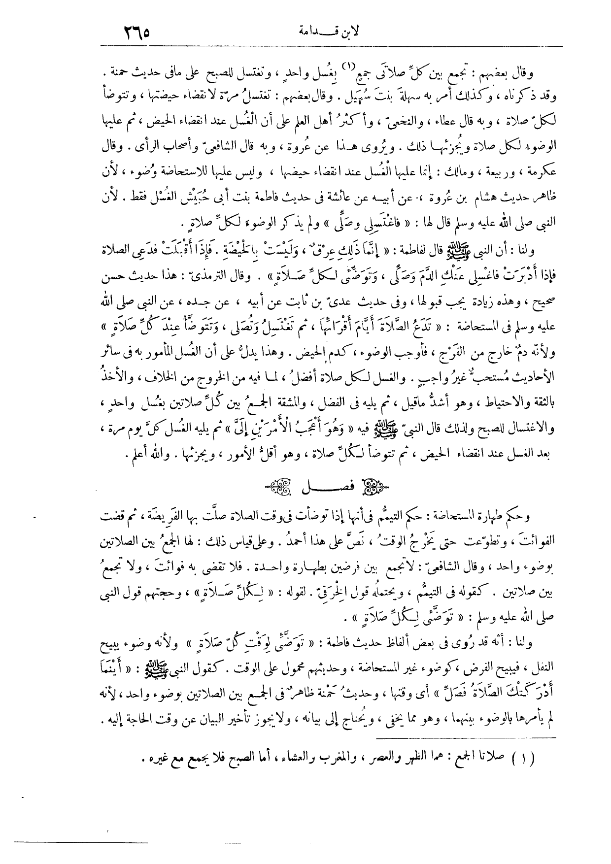 (٥١١) فَصْلٌ: وَحُكْمُ طَهَارَةِ الْمُسْتَحَاضَةِ حُكْمُ التَّيَمُّمِ فِي أَنَّهَا إذَا تَوَضَّأَتْ فِي وَقْتِ الصَّلَاةِ، صَلَّتْ بِهَا الْفَرِيضَةَ، ثُمَّ قَضَتْ الْفَوَائِتَ، وَتَطَوَّعَتْ حَتَّى يَخْرُجَ الْوَقْتُ نَصَّ عَلَى هَذَا أَحْمَدُ وَعَلَى قِيَاسِ ذَلِكَ لَهَا الْجَمْعُ بَيْنَ الصَّلَاتَيْنِ بِوُضُوءٍ وَاحِدٍ. وَقَالَ الشَّافِعِيُّ: لَا تَجْمَعُ بَيْنَ فَرْضَيْنِ بِطَهَارَةٍ وَاحِدَةٍ. وَلَا تَقْضِي بِهِ فَوَائِتَ، وَلَا تَجْمَعُ بَيْنَ صَلَاتَيْنِ. كَقَوْلِهِ فِي التَّيَمُّمِ.