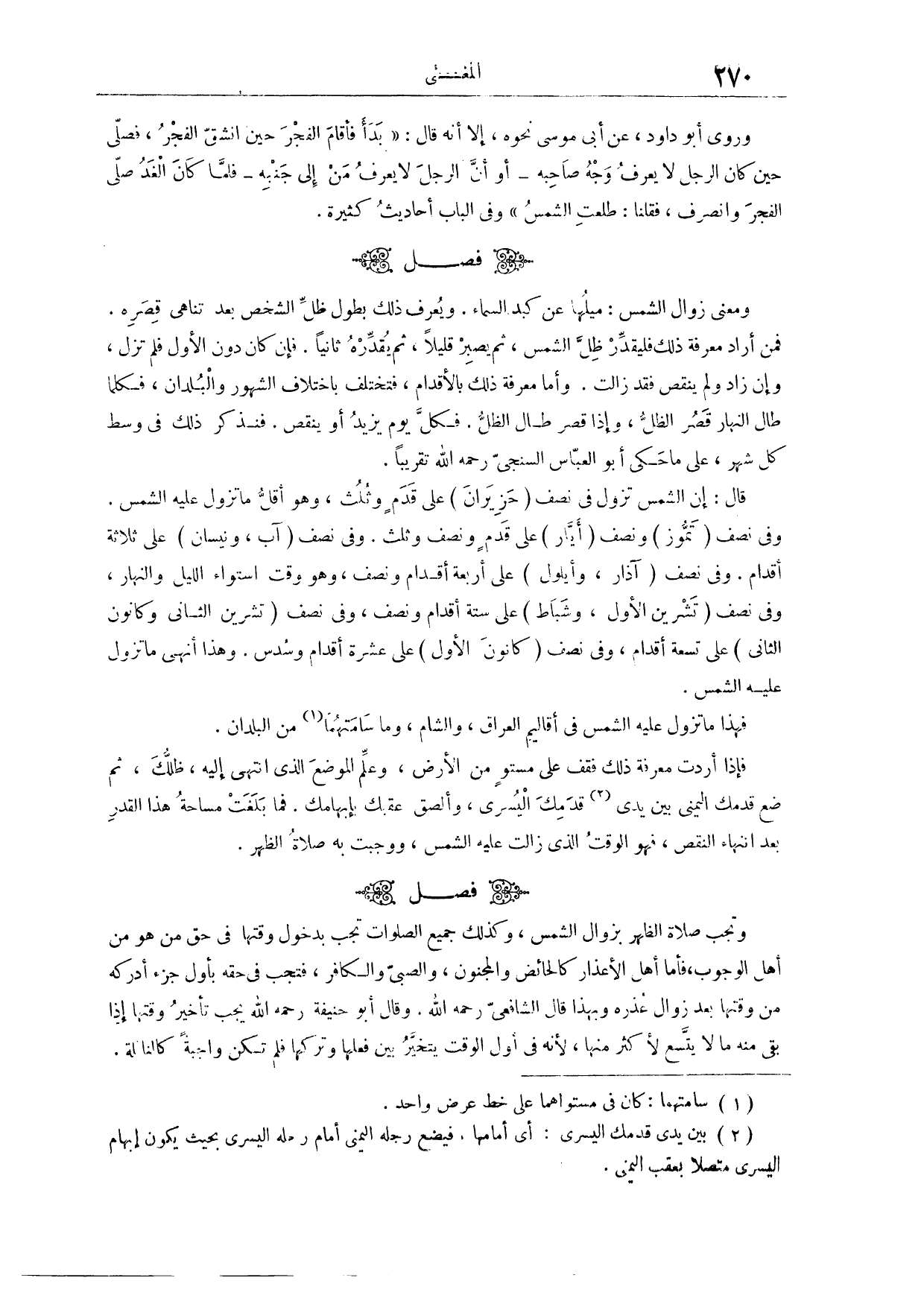 (٥١٥) فَصْلٌ: وَمَعْنَى زَوَالِ الشَّمْسِ مَيْلُهَا عَنْ كَبِدِ السَّمَاءِ، وَيُعْرَفُ ذَلِكَ بِطُولِ ظِلِّ الشَّخْصِ بَعْدَ تَنَاهِي قِصَرِهِ، فَمَنْ أَرَادَ مَعْرِفَةَ ذَلِكَ فَلْيُقَدِّرْ ظِلَّ الشَّمْسِ، ثُمَّ يَصْبِرْ قَلِيلًا، ثُمَّ يُقَدِّرْهُ ثَانِيًا، فَإِنْ كَانَ دُونَ الْأَوَّلِ فَلَمْ تَزُلْ، وَإِنْ زَادَ وَلَمْ يَنْقُصْ فَقَدْ زَالَتْ، وَأَمَّا مَعْرِفَةُ ذَلِكَ بِالْأَقْدَامِ، فَتَخْتَلِفُ بِاخْتِلَافِ الشُّهُورِ وَالْبُلْدَانِ، فَكُلَّمَا طَالَ النَّهَارُ قَصُرَ الظِّلُّ، وَإِذَا قَصُرَ طَالَ الظِّلُّ، فَكُلُّ يَوْمٍ يَزِيدُ أَوْ يَنْقُصُ، فَنَذْكُرُ ذَلِكَ فِي وَسَطِ كُلِّ شَهْرٍ، عَلَى مَا حَكَى أَبُو الْعَبَّاسِ السِّنْجِيُّ، - رَحِمَهُ اللَّهُ -، تَقْرِيبًا، قَالَ: إنَّ الشَّمْسَ تَزُولُ فِي نِصْفِ حُزَيْرَانَ عَلَى قَدَمٍ وَثُلُثٍ، وَهُوَ أَقَلُّ مَا تَزُولُ عَلَيْهِ الشَّمْسُ، وَفِي نِصْفِ تَمُّوز وَنِصْفِ أَيَّارَ عَلَى قَدَمٍ وَنِصْفٍ وَثُلُثٍ، وَفِي نِصْفِ آبَ وَنَيْسَان عَلَى ثَلَاثَةِ أَقْدَامٍ، وَفِي نِصْفِ آذَار وَأَيْلُول عَلَى أَرْبَعَةِ أَقْدَامٍ وَنِصْفٍ.