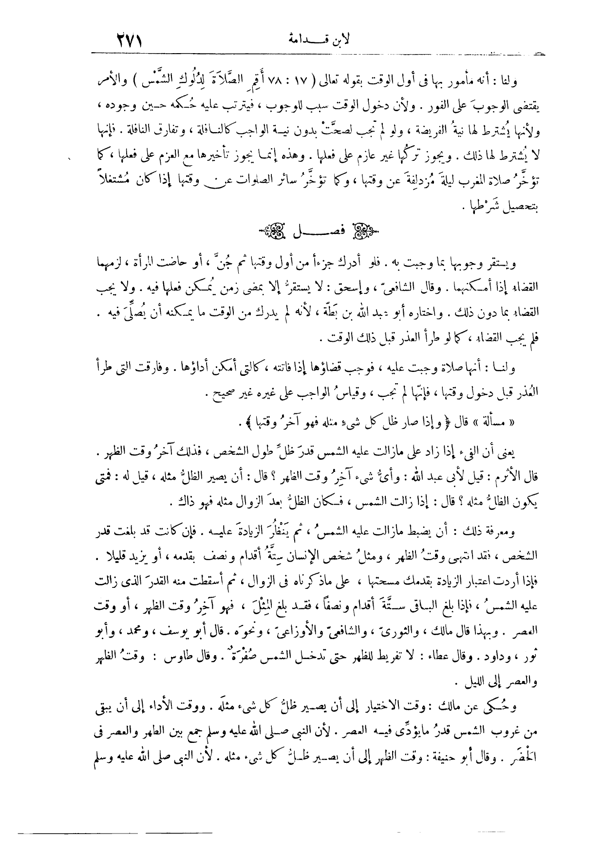 (٥١٨) مَسْأَلَةٌ: قَالَ: (فَإِذَا صَارَ ظِلُّ كُلِّ شَيْءٍ مِثْلَهُ فَهُوَ آخِرُ وَقْتِهَا) يَعْنِي أَنَّ الْفَيْءَ إذَا زَادَ عَلَى مَا زَالَتْ عَلَيْهِ الشَّمْسُ قَدْرَ ظِلِّ طُولِ الشَّخْصِ، فَذَلِكَ آخِرُ وَقْتِ الظُّهْرِ. قَالَ الْأَثْرَمُ: قِيلَ لِأَبِي عَبْدِ اللَّهِ: وَأَيُّ شَيْءٍ آخِرُ وَقْتِ الظُّهْرِ؟ قَالَ: أَنْ يَصِيرَ الظِّلُّ مِثْلَهُ. قِيلَ لَهُ: فَمَتَى يَكُونُ الظِّلُّ مِثْلَهُ؟ قَالَ: إذَا زَالَتْ الشَّمْسُ، فَكَانَ الظِّلُّ بَعْدَ الزَّوَالِ مِثْلَهُ، فَهُوَ ذَاكَ. وَمَعْرِفَةُ ذَلِكَ أَنْ يَضْبِطَ مَا زَالَتْ عَلَيْهِ الشَّمْسُ، ثُمَّ يَنْظُرَ الزِّيَادَةَ عَلَيْهِ، فَإِنْ كَانَتْ قَدْ بَلَغَتْ قَدْرَ الشَّخْصِ، فَقَدْ انْتَهَى وَقْتُ الظُّهْرِ؛ وَمِثْلُ شَخْصِ الْإِنْسَانِ سِتَّةُ أَقْدَامٍ وَنِصْفٍ بِقَدَمِهِ، أَوْ يَزِيدُ قَلِيلًا، فَإِذَا أَرَدْت اعْتِبَارَ الزِّيَادَةِ بِقَدَمِك مَسَحْتَهَا عَلَى مَا ذَكَرْنَاهُ فِي الزَّوَالِ، ثُمَّ أَسْقَطْت مِنْهُ الْقَدْرَ الَّذِي زَالَتْ عَلَيْهِ الشَّمْسُ، فَإِذَا بَلَغَ الْبَاقِي سِتَّةَ أَقْدَامٍ وَنِصْفٍ فَقَدْ بَلَغَ الْمِثْلَ، فَهُوَ آخِرُ وَقْتِ الظُّهْرِ، وَأُوَلُ وَقْتِ الْعَصْرِ.