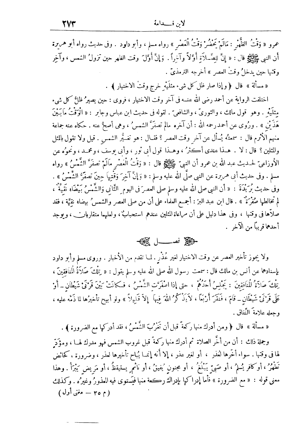 (٥٢١) فَصْلٌ: وَلَا يَجُوزُ تَأْخِيرُ الْعَصْرِ عَنْ وَقْتِ الِاخْتِيَارِ لِغَيْرِ عُذْرٍ؛ لِمَا تَقَدَّمَ مِنْ الْأَخْبَارِ، وَرَوَى مُسْلِمٌ وَأَبُو دَاوُد بِإِسْنَادِهِمَا، عَنْ أَنَسِ بْنِ مَالِكٍ، قَالَ: سَمِعْت رَسُولَ اللَّهِ - صَلَّى اللَّهُ عَلَيْهِ وَسَلَّمَ - يَقُولُ: «تِلْكَ صَلَاةُ الْمُنَافِقِينَ، تِلْكَ صَلَاةُ الْمُنَافِقِينَ، تِلْكَ صَلَاةُ الْمُنَافِقِينَ، يَجْلِسُ أَحَدُهُمْ، حَتَّى إذَا اصْفَرَّتْ الشَّمْسُ، فَكَانَتْ بَيْنَ قَرْنَيْ شَيْطَانٍ، أَوْ عَلَى قَرْنَيْ شَيْطَانٍ، قَامَ، فَنَقَرَ أَرْبَعًا، لَا يَذْكُرُ اللَّهَ فِيهَا إلَّا قَلِيلًا» وَلَوْ أُبِيحَ تَأْخِيرُهَا لَمَا ذَمَّهُ عَلَيْهِ، وَجَعَلَهُ عَلَامَةَ النِّفَاقِ.