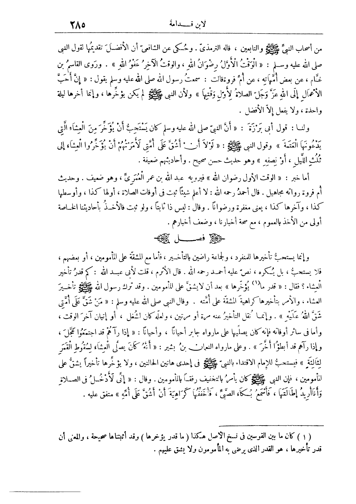 (٥٣٩) فَصْلٌ: وَإِنَّمَا يُسْتَحَبُّ تَأْخِيرُهَا لِلْمُنْفَرِدِ وَالْجَمَاعَةُ رَاضِينَ بِالتَّأْخِيرِ؛ فَأَمَّا مَعَ الْمَشَقَّةِ عَلَى الْمَأْمُومِينَ أَوْ بَعْضِهِمْ فَلَا يُسْتَحَبُّ، بَلْ يُكْرَهُ. نَصَّ عَلَيْهِ أَحْمَدُ - رَحِمَهُ اللَّهُ -، قَالَ الْأَثْرَمُ: قُلْت لِأَبِي عَبْدِ اللَّهِ: كَمْ قَدْرُ تَأْخِيرِ الْعِشَاءِ؟ فَقَالَ مَا قَدْ بَعُدَ أَنْ لَا يَشُقَّ عَلَى الْمَأْمُومِينَ. وَقَدْ تَرَكَ رَسُولُ اللَّهِ - صَلَّى اللَّهُ عَلَيْهِ وَسَلَّمَ - تَأْخِيرَ الْعِشَاءِ، وَالْأَمْرَ بِتَأْخِيرِهَا، كَرَاهِيَةَ الْمَشَقَّةِ عَلَى أُمَّتِهِ، وَقَالَ النَّبِيُّ - صَلَّى اللَّهُ عَلَيْهِ وَسَلَّمَ - «مَنْ شَقَّ عَلَى أُمَّتِي شَقَّ اللَّهُ عَلَيْهِ» وَإِنَّمَا نُقِلَ التَّأْخِيرُ عَنْهُ مَرَّةً أَوْ مَرَّتَيْنِ، وَلَعَلَّهُ كَانَ لِشُغْلٍ، أَوْ إتْيَانِ آخِرِ الْوَقْتِ، وَأَمَّا فِي سَائِرِ أَوْقَاتِهِ فَإِنَّهُ كَانَ يُصَلِّيهَا، عَلَى مَا رَوَاهُ جَابِرٌ أَحْيَانًا، وَأَحْيَانًا إذَا رَآهُمْ قَدْ اجْتَمَعُوا عَجَّلَ، وَإِذَا رَآهُمْ قَدْ أَبْطَئُوا أَخَّرَ.