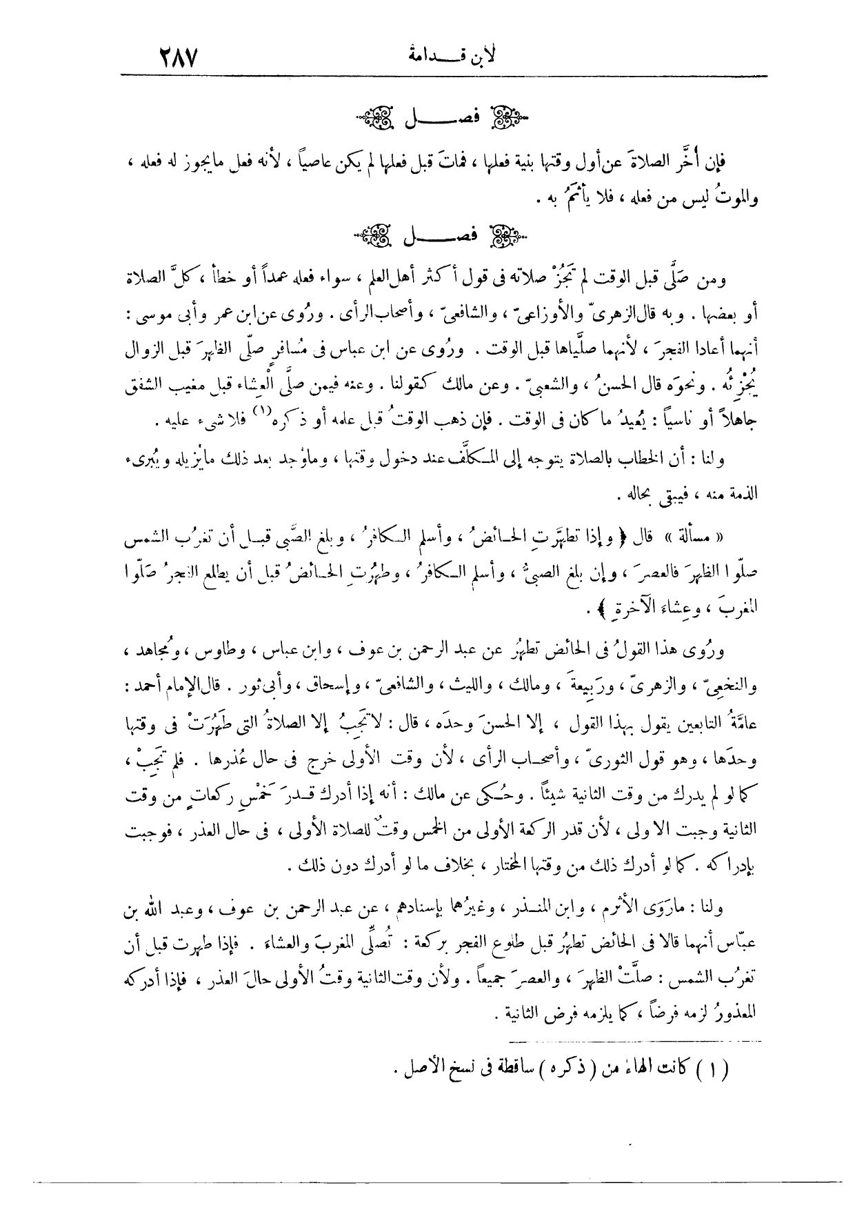 (٥٤٣) فَصْلٌ: وَمَنْ صَلَّى قَبْلَ الْوَقْتِ، لَمْ يَجُزْ صَلَاتُهُ، فِي قَوْلِ أَكْثَرِ أَهْلِ الْعِلْمِ، سَوَاءٌ فَعَلَهُ عَمْدًا أَوْ خَطَأً، كُلَّ الصَّلَاةِ أَوْ بَعْضَهَا. وَبِهِ قَالَ الزُّهْرِيُّ، وَالْأَوْزَاعِيُّ وَالشَّافِعِيُّ، وَأَصْحَابُ الرَّأْيِ. وَرُوِيَ عَنْ ابْنِ عُمَرَ، وَأَبِي مُوسَى أَنَّهُمَا أَعَادَا الْفَجْرَ، لِأَنَّهُمَا صَلَّيَاهَا قَبْلَ الْوَقْتِ. وَرُوِيَ عَنْ ابْنِ عَبَّاسٍ فِي مُسَافِرٍ صَلَّى الظُّهْرَ قَبْلَ الزَّوَالِ، يُجْزِئُهُ. وَنَحْوَهُ قَالَ الْحَسَنُ، وَالشَّعْبِيُّ. وَعَنْ مَالِكٍ كَقَوْلِنَا. وَعَنْهُ فِيمَنْ صَلَّى الْعِشَاءَ قَبْلَ مَغِيبِ الشَّفَقِ جَاهِلًا أَوْ نَاسِيًا، يُعِيدُ مَا كَانَ فِي الْوَقْتِ، فَإِنْ ذَهَبَ الْوَقْتُ قَبْلَ عِلْمِهِ، أَوْ ذَكَرَ، فَلَا شَيْءَ عَلَيْهِ. وَلَنَا أَنَّ الْخِطَابَ بِالصَّلَاةِ يَتَوَجَّهُ إلَى الْمُكَلَّفِ عِنْدَ دُخُولِ وَقْتِهَا، وَمَا وُجِدَ بَعْدَ ذَلِكَ مَا يُزِيلُهُ وَيُبْرِئُ الذِّمَّةَ مِنْهُ، فَيَبْقَى بِحَالِهِ.