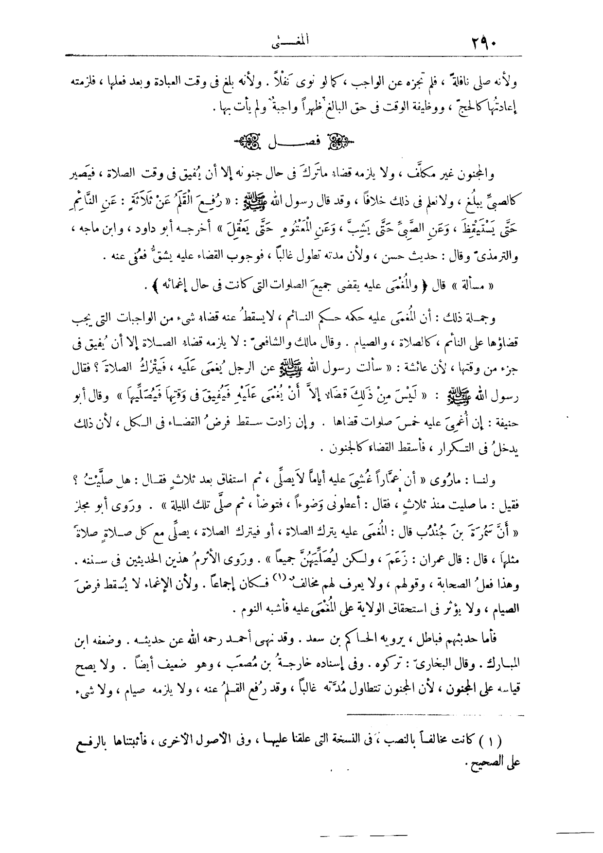 (٥٤٩) فَصْلٌ: وَالْمَجْنُونُ غَيْرُ مُكَلَّفٍ، وَلَا يَلْزَمُهُ قَضَاءُ مَا تَرَكَ فِي حَالِ جُنُونِهِ، إلَّا أَنْ يُفِيقَ وَقْتَ الصَّلَاةِ، فَيَصِيرَ كَالصَّبِيِّ يَبْلُغُ. وَلَا نَعْلَمُ فِي ذَلِكَ خِلَافًا، وَقَدْ قَالَ رَسُولُ اللَّهِ - صَلَّى اللَّهُ عَلَيْهِ وَسَلَّمَ -: «رُفِعَ الْقَلَمُ عَنْ ثَلَاثَةٍ؛ عَنْ النَّائِمِ حَتَّى يَسْتَيْقِظَ، وَعَنْ الصَّبِيِّ حَتَّى يَشِبَّ، وَعَنْ الْمَعْتُوهِ حَتَّى يَعْقِلَ» . أَخْرَجَهُ أَبُو دَاوُد، وَابْنُ مَاجَهْ، وَالتِّرْمِذِيُّ، وَقَالَ: حَدِيثٌ حَسَنٌ. وَلِأَنَّ مُدَّتَهُ تَطُولُ غَالِبًا، فَوُجُوبُ الْقَضَاءِ عَلَيْهِ يَشُقُّ، فَعُفِيَ عَنْهُ.
