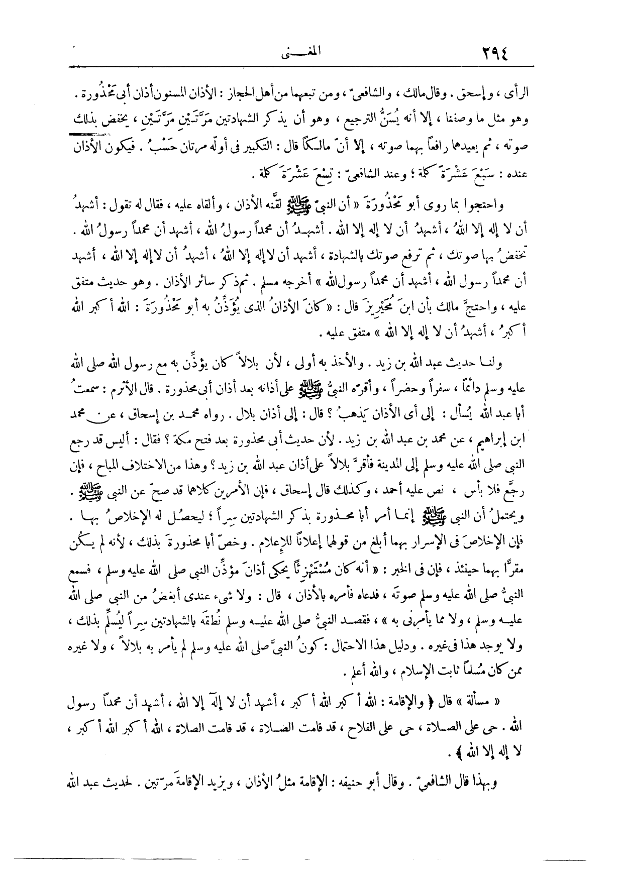 قِيلَ لِأَبِي عَبْدِ اللَّهِ: أَلَيْسَ حَدِيثُ أَبِي مَحْذُورَةَ بَعْدَ حَدِيثِ عَبْدِ اللَّهِ بْنِ زَيْدٍ؛ لِأَنَّ حَدِيثَ أَبِي مَحْذُورَةَ بَعْدَ فَتْحِ مَكَّةَ؟ فَقَالَ: أَلَيْسَ قَدْ رَجَعَ النَّبِيُّ - صَلَّى اللَّهُ عَلَيْهِ وَسَلَّمَ - إلَى الْمَدِينَةِ؛ فَأَقَرَّ بِلَالًا عَلَى أَذَانِ عَبْدِ اللَّهِ بْنِ زَيْدٍ؟ وَهَذَا مِنْ الِاخْتِلَافِ الْمُبَاحِ، فَإِنْ رَجَّعَ فَلَا بَأْسَ. نَصَّ عَلَيْهِ أَحْمَدُ. وَكَذَلِكَ قَالَ إِسْحَاقُ فَإِنَّ الْأَمْرَيْنِ كِلَيْهِمَا قَدْ صَحَّ عَنْ النَّبِيِّ - صَلَّى اللَّهُ عَلَيْهِ وَسَلَّمَ -، وَيَحْتَمِلُ أَنَّ النَّبِيَّ - صَلَّى اللَّهُ عَلَيْهِ وَسَلَّمَ - إنَّمَا أَمَرَ أَبَا مَحْذُورَةَ بِذِكْرِ الشَّهَادَتَيْنِ سِرًّا، لِيَحْصُلَ لَهُ الْإِخْلَاصُ بِهِمَا، فَإِنَّ الْإِخْلَاصَ فِي الْإِسْرَارِ بِهِمَا أَبْلَغُ مِنْ قَوْلِهِمَا إعْلَانًا لِلْإِعْلَامِ، وَخَصَّ أَبَا مَحْذُورَةَ بِذَلِكَ، لِأَنَّهُ لَمْ يَكُنْ مُقِرًّا بِهِمَا حِينَئِذٍ، فَإِنَّ فِي الْخَبَرِ «أَنَّهُ كَانَ مُسْتَهْزِئًا يَحْكِي أَذَانَ مُؤَذِّنِ النَّبِيِّ - صَلَّى اللَّهُ عَلَيْهِ وَسَلَّمَ - فَسَمِعَ النَّبِيُّ - صَلَّى اللَّهُ عَلَيْهِ وَسَلَّمَ - صَوْتَهُ، فَدَعَاهُ، فَأَمَرَهُ بِالْأَذَانِ، قَالَ: وَلَا شَيْءَ عِنْدِي أَبْغَضُ مِنْ النَّبِيِّ - صَلَّى اللَّهُ عَلَيْهِ وَسَلَّمَ - وَلَا مِمَّا يَأْمُرُنِي بِهِ» .