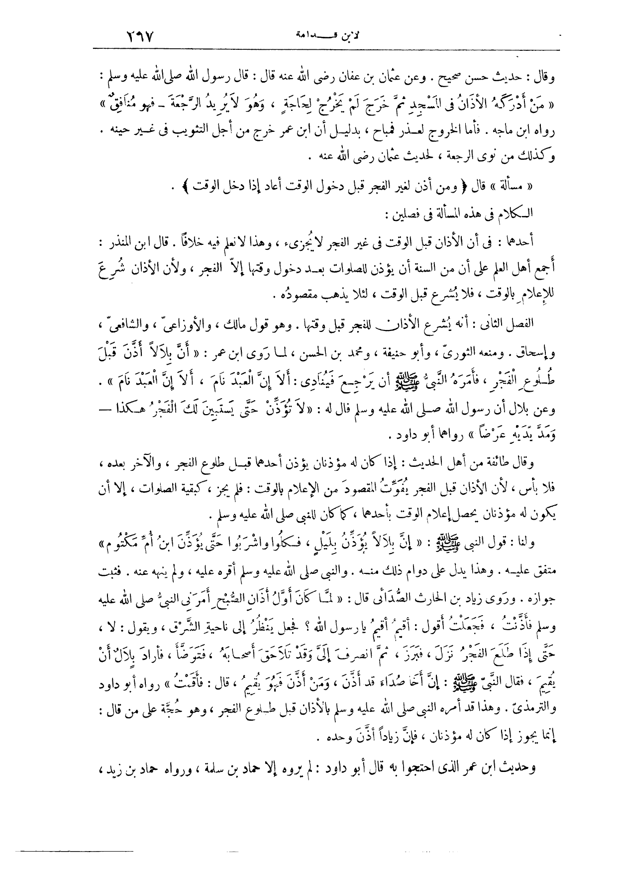 (٥٦٤) فَصْلٌ: الْفَصْلُ الثَّانِي، أَنَّهُ يُشْرَعُ الْأَذَانُ لِلْفَجْرِ قَبْلَ وَقْتِهَا. وَهُوَ قَوْلُ مَالِكٍ، وَالْأَوْزَاعِيِّ، وَالشَّافِعِيِّ، وَإِسْحَاقَ. وَمَنَعَهُ الثَّوْرِيُّ، وَأَبُو حَنِيفَةَ، وَمُحَمَّدُ بْنُ الْحَسَنِ؛ لِمَا رَوَى ابْنُ عُمَرَ، «أَنَّ بِلَالًا أَذَّنَ قَبْلَ طُلُوعِ الْفَجْرِ، فَأَمَرَهُ النَّبِيُّ - صَلَّى اللَّهُ عَلَيْهِ وَسَلَّمَ - أَنْ يَرْجِعَ فَيُنَادِيَ: أَلَا إنَّ الْعَبْدَ نَامَ، أَلَا إنَّ الْعَبْدَ نَامَ» وَعَنْ بِلَالٍ «أَنَّ رَسُولَ اللَّهِ - صَلَّى اللَّهُ عَلَيْهِ وَسَلَّمَ - قَالَ لَهُ: لَا تُؤَذِّنْ حَتَّى يَسْتَبِينَ لَك الْفَجْرُ هَكَذَا وَمَدَّ يَدَيْهِ عَرْضًا» . رَوَاهُمَا أَبُو دَاوُد. وَقَالَ طَائِفَةٌ مِنْ أَهْلِ الْحَدِيثِ: إذَا كَانَ لَهُ مُؤَذِّنَانِ، يُؤَذِّنُ أَحَدُهُمَا قَبْلَ طُلُوعِ الْفَجْرِ، وَالْآخَرُ بَعْدَهُ، فَلَا بَأْسَ؛ لِأَنَّ الْأَذَانَ قَبْلَ الْفَجْرِ يُفَوِّتُ الْمَقْصُودَ مِنْ الْإِعْلَامِ بِالْوَقْتِ، فَلَمْ يَجُزْ، كَبَقِيَّةِ الصَّلَوَاتِ، إلَّا أَنْ يَكُونَ لَهُ مُؤَذِّنَانِ يَحْصُلُ إعْلَامُ الْوَقْتِ بِأَحَدِهِمَا، كَمَا كَانَ النَّبِيُّ - صَلَّى اللَّهُ عَلَيْهِ وَسَلَّمَ -