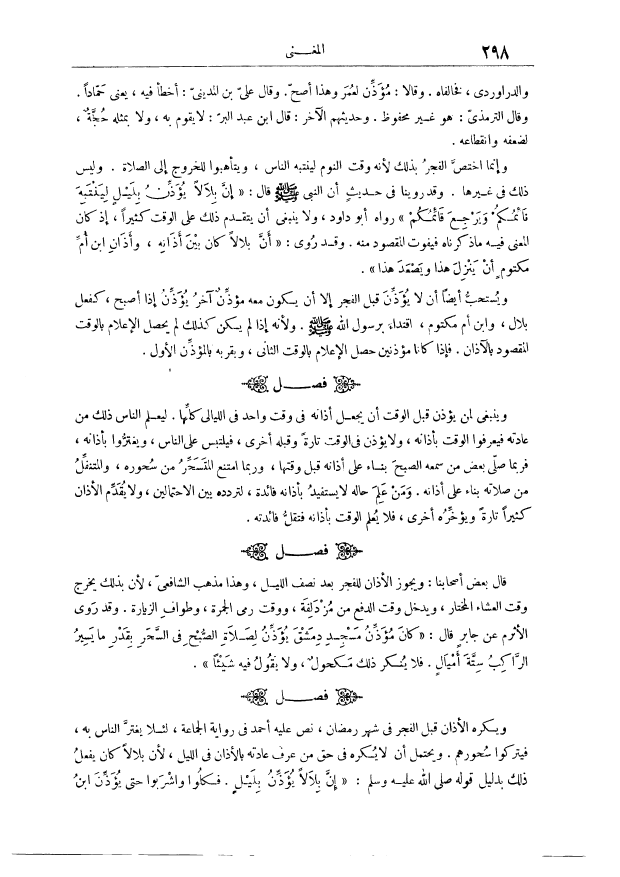(٥٦٧) فَصْلٌ: وَيُكْرَهُ الْأَذَانُ قَبْلَ الْفَجْرِ فِي شَهْرِ رَمَضَانَ. نَصَّ عَلَيْهِ أَحْمَدُ، فِي رِوَايَةِ الْجَمَاعَةِ، لِئَلَّا يَغْتَرَّ النَّاسُ بِهِ فَيَتْرُكُوا سَحُورَهُمْ. وَيَحْتَمِلُ أَنْ لَا يُكْرَهَ فِي حَقِّ مَنْ عَرَفَ عَادَتَهُ بِالْأَذَانِ فِي اللَّيْلِ؛ لِأَنَّ بِلَالًا كَانَ يَفْعَلُ ذَلِكَ، بِدَلِيلِ قَوْلِهِ - عَلَيْهِ السَّلَامُ -: «إنَّ بِلَالًا يُؤَذِّنُ بِلَيْلٍ، فَكُلُوا وَاشْرَبُوا حَتَّى يُؤَذِّنَ ابْنُ