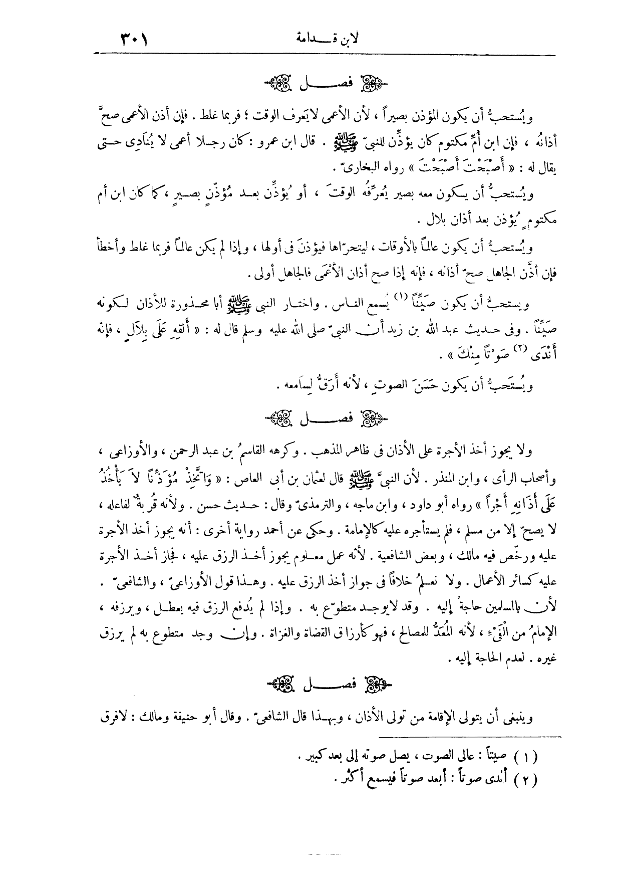 (٥٧١) فَصْلٌ: وَيُسْتَحَبُّ أَنْ يَكُونَ الْمُؤَذِّنُ بَصِيرًا؛ لِأَنَّ الْأَعْمَى لَا يَعْرِفُ الْوَقْتَ، فَرُبَّمَا غَلِطَ، فَإِنْ أَذَّنَ الْأَعْمَى صَحَّ أَذَانُهُ فَإِنَّ ابْنَ أُمِّ مَكْتُومٍ كَانَ يُؤَذِّنُ لِلنَّبِيِّ - صَلَّى اللَّهُ عَلَيْهِ وَسَلَّمَ - قَالَ ابْنُ عَمْرٍو: كَانَ رَجُلًا أَعْمَى لَا يُنَادِي حَتَّى يُقَالَ لَهُ " أَصْبَحْتَ أَصْبَحْتَ " رَوَاهُ الْبُخَارِيُّ. وَيُسْتَحَبُّ أَنْ يَكُونَ مَعَهُ بَصِيرٌ يُعَرِّفُهُ الْوَقْتَ، أَوْ يُؤَذِّنَ بَعْدَ مُؤَذِّنٍ بَصِيرٍ، كَمَا كَانَ ابْنُ أُمِّ مَكْتُومٍ يُؤَذِّنُ بَعْدَ أَذَانِ بِلَالٍ وَيُسْتَحَبُّ أَنْ يَكُونَ عَالِمًا بِالْأَوْقَاتِ؛ لِيَتَحَرَّاهَا، فَيُؤَذِّنَ فِي أَوَّلِهَا، وَإِذَا لَمْ يَكُنْ عَالِمًا فَرُبَّمَا غَلِطَ وَأَخْطَأَ. فَإِنْ أَذَّنَ الْجَاهِلُ صَحَّ أَذَانُهُ، فَإِنَّهُ إذَا صَحَّ أَذَانُ الْأَعْمَى فَالْجَاهِلُ أَوْلَى.