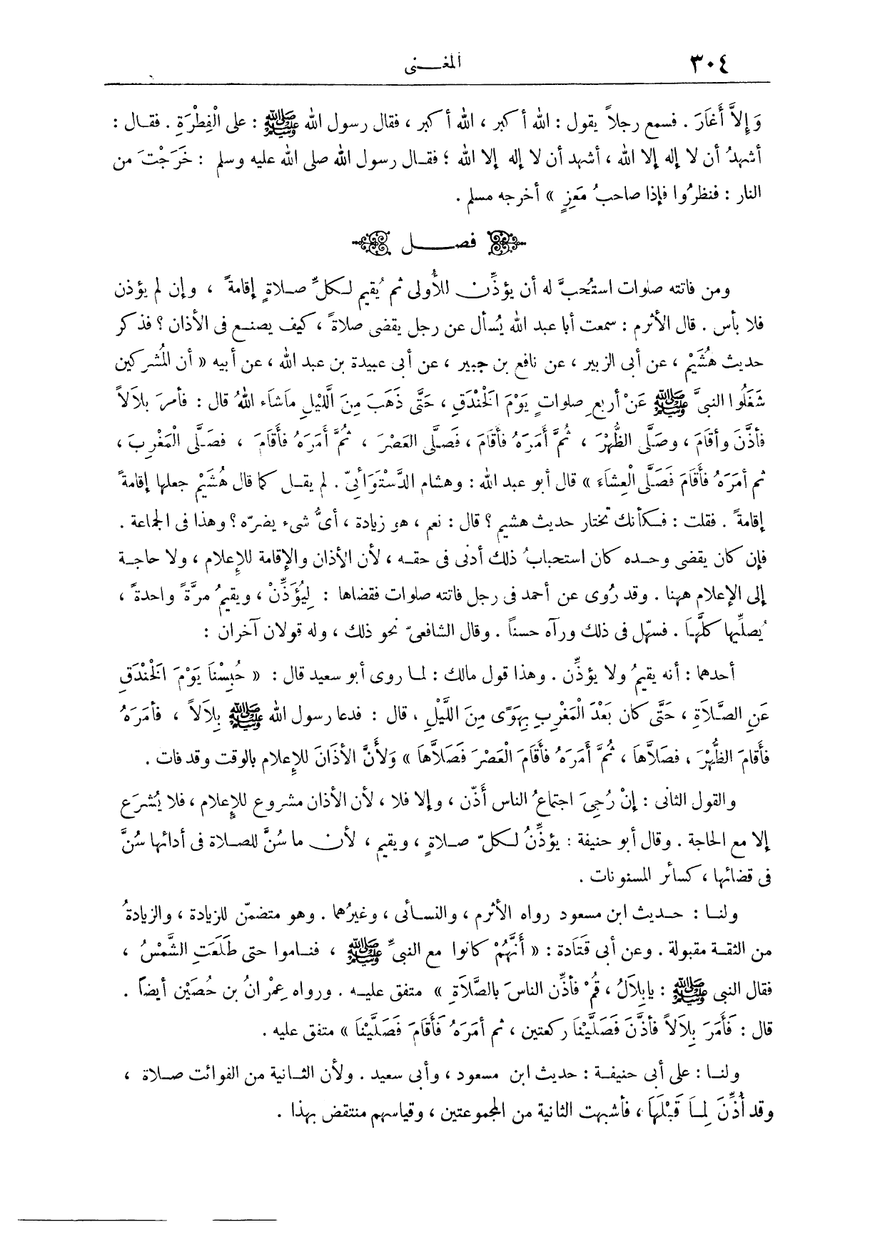 فَصْلٌ: وَمَنْ فَاتَتْهُ صَلَوَاتٌ اُسْتُحِبَّ لَهُ أَنْ يُؤَذِّنَ لِلْأُولَى، ثُمَّ يُقِيمَ لِكُلِّ صَلَاةٍ إقَامَةً، وَإِنْ لَمْ يُؤَذِّنْ فَلَا بَأْسَ. قَالَ الْأَثْرَمُ؛ سَمِعْتُ أَبَا عَبْدِ اللَّهِ يُسْأَلُ عَنْ رَجُلٍ يَقْضِي صَلَاةً، كَيْفَ يَصْنَعُ فِي الْأَذَانِ؟ فَذَكَرَ حَدِيثَ هُشَيْمٍ، عَنْ أَبِي الزُّبَيْرِ، عَنْ نَافِعِ بْنِ جُبَيْرٍ، عَنْ أَبِي عُبَيْدَةَ بْنِ عَبْدِ اللَّهِ، عَنْ أَبِيهِ «أَنَّ الْمُشْرِكِينَ شَغَلُوا النَّبِيَّ - صَلَّى اللَّهُ عَلَيْهِ وَسَلَّمَ - عَنْ أَرْبَعِ صَلَوَاتٍ يَوْمَ الْخَنْدَقِ، حَتَّى ذَهَبَ مِنْ اللَّيْلِ مَا شَاءَ اللَّهُ، قَالَ: فَأَمَرَ بِلَالًا فَأَذَّنَ وَأَقَامَ، وَصَلَّى الظُّهْرَ، ثُمَّ أَمَرَهُ فَأَقَامَ، فَصَلَّى الْعَصْرَ، ثُمَّ أَمَرَهُ فَأَقَامَ، فَصَلَّى الْمَغْرِبَ، ثُمَّ أَمَرَهُ فَأَقَامَ، فَصَلَّى الْعِشَاءَ» قَالَ أَبُو عَبْدِ اللَّهِ وَهِشَامٌ الدَّسْتُوَائِيُّ لَمْ يَقُلْ كَمَا قَالَ هُشَيْمٌ، جَعَلَهَا إقَامَةً إقَامَةً.