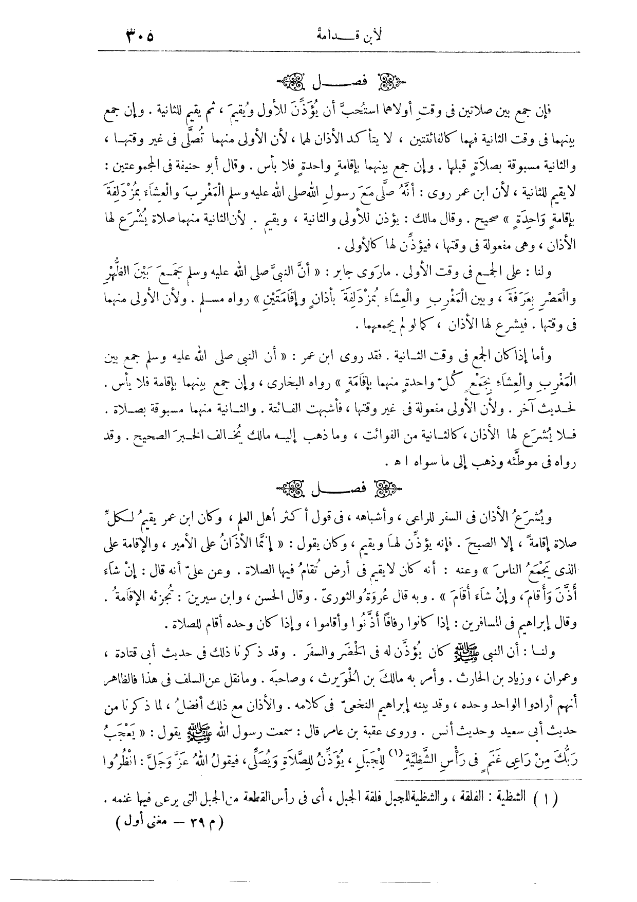 (٥٨٠) فَصْلٌ: وَيُشْرَعُ الْأَذَانُ فِي السَّفَرِ لِلرَّاعِي وَأَشْبَاهِهِ، فِي قَوْلِ أَكْثَرِ أَهْلِ الْعِلْمِ، وَكَانَ ابْنُ عُمَرَ يُقِيمُ لِكُلِّ صَلَاةٍ إقَامَةً، إلَّا الصُّبْحَ، فَإِنَّهُ يُؤَذِّنُ لَهَا وَيُقِيمُ، وَكَانَ يَقُولُ: إنَّمَا الْأَذَانُ عَلَى الْأَمِيرِ، وَالْإِقَامَةُ عَلَى الَّذِي يَجْمَعُ النَّاسَ، وَعَنْهُ، أَنَّهُ كَانَ لَا يُقِيمُ فِي أَرْضٍ تُقَامُ فِيهَا الصَّلَاةُ وَعَنْ عَلِيٍّ أَنَّهُ قَالَ: إنْ شَاءَ أَذَّنَ وَأَقَامَ، وَإِنْ شَاءَ أَقَامَ وَبِهِ قَالَ عُرْوَةُ، وَالثَّوْرِيُّ. وَقَالَ الْحَسَنُ، وَابْنُ سِيرِينَ: تُجْزِئُهُ الْإِقَامَةُ.