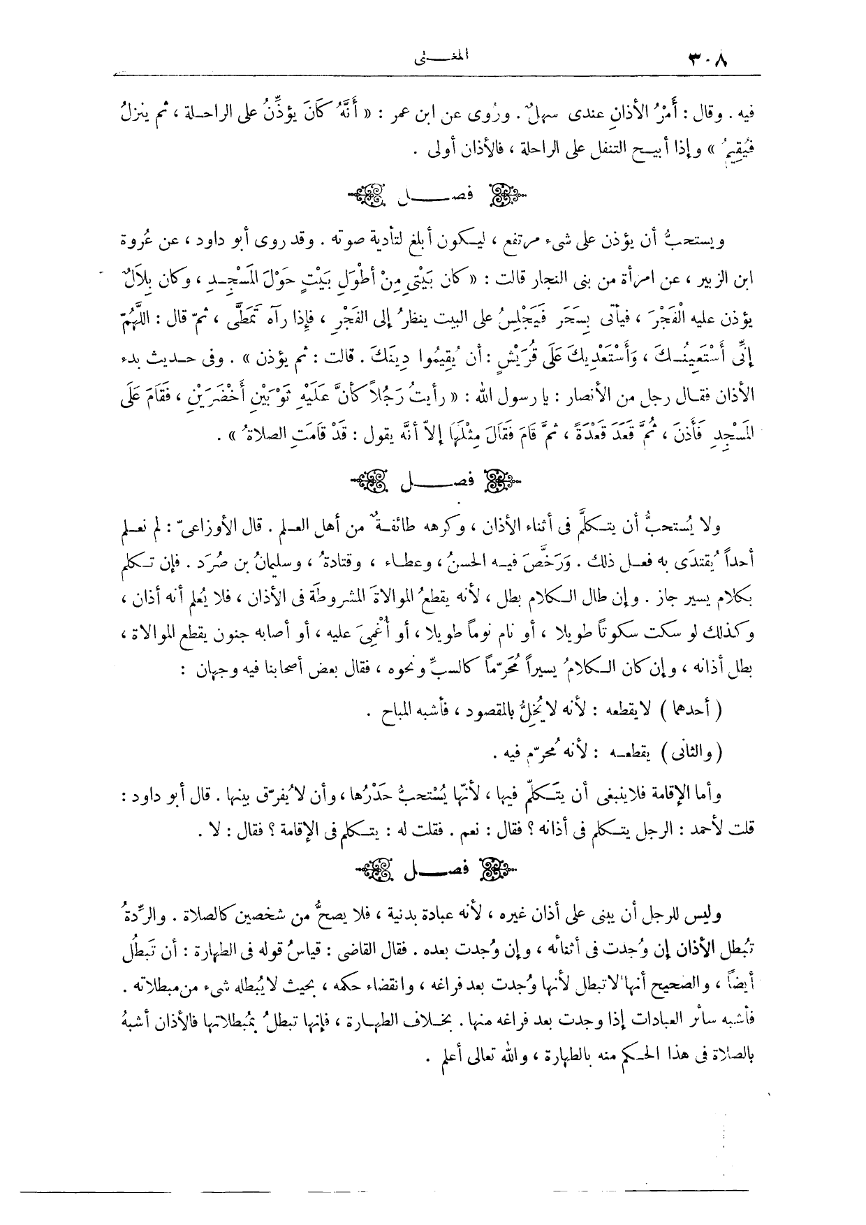 (٥٨٧) فَصْلٌ: وَلَا يُسْتَحَبُّ أَنْ يَتَكَلَّمَ فِي أَثْنَاءِ الْأَذَانِ وَكَرِهَهُ طَائِفَةٌ مِنْ أَهْلِ الْعِلْمِ، قَالَ الْأَوْزَاعِيُّ: لَمْ نَعْلَمْ أَحَدًا يَقْتَدِي بِهِ فَعَلَ ذَلِكَ. وَرَخَّصَ فِيهِ الْحَسَنُ، وَعَطَاءٌ، وَقَتَادَةُ، وَسُلَيْمَانُ بْنُ صُرَدٍ. فَإِنْ تَكَلَّمَ بِكَلَامٍ يَسِيرٍ جَازَ. وَإِنْ طَالَ الْكَلَامُ بَطَلَ الْأَذَانُ؛ لِأَنَّهُ يَقْطَعُ الْمُوَالَاةَ الْمَشْرُوطَةَ فِي الْأَذَانِ، فَلَا يُعْلَمُ أَنَّهُ أَذَانٌ. وَكَذَلِكَ لَوْ سَكَتَ سُكُوتًا طَوِيلًا، أَوْ نَامَ نَوْمًا طَوِيلًا، أَوْ أُغْمِيَ عَلَيْهِ، أَوْ أَصَابَهُ جُنُونٌ يَقْطَعُ الْمُوَالَاةَ، بَطَلَ أَذَانُهُ. وَإِنْ كَانَ الْكَلَامُ يَسِيرًا مُحَرَّمًا كَالسَّبِّ وَنَحْوِهِ، فَقَالَ بَعْضُ أَصْحَابِنَا: فِيهِ وَجْهَانِ، أَحَدُهُمَا، لَا يَقْطَعُهُ؛ لِأَنَّهُ لَا يُخِلُّ بِالْمَقْصُودِ، فَأَشْبَهَ الْمُبَاحَ. وَالثَّانِي؛ يَقْطَعُهُ؛ لِأَنَّهُ مُحَرَّمٌ فِيهِ. وَأَمَّا الْإِقَامَةُ فَلَا يَنْبَغِي أَنْ يَتَكَلَّمَ فِيهَا؛ لِأَنَّهَا يُسْتَحَبُّ حَدْرُهَا، وَأَنْ لَا يُفَرِّقَ بَيْنَهُمَا. قَالَ أَبُو دَاوُد: قُلْت لِأَحْمَدَ: الرَّجُلُ يَتَكَلَّمُ فِي أَذَانِهِ؟ فَقَالَ: نَعَمْ. فَقُلْتُ لَهُ: يَتَكَلَّمُ فِي الْإِقَامَةِ؟ فَقَالَ: لَا.