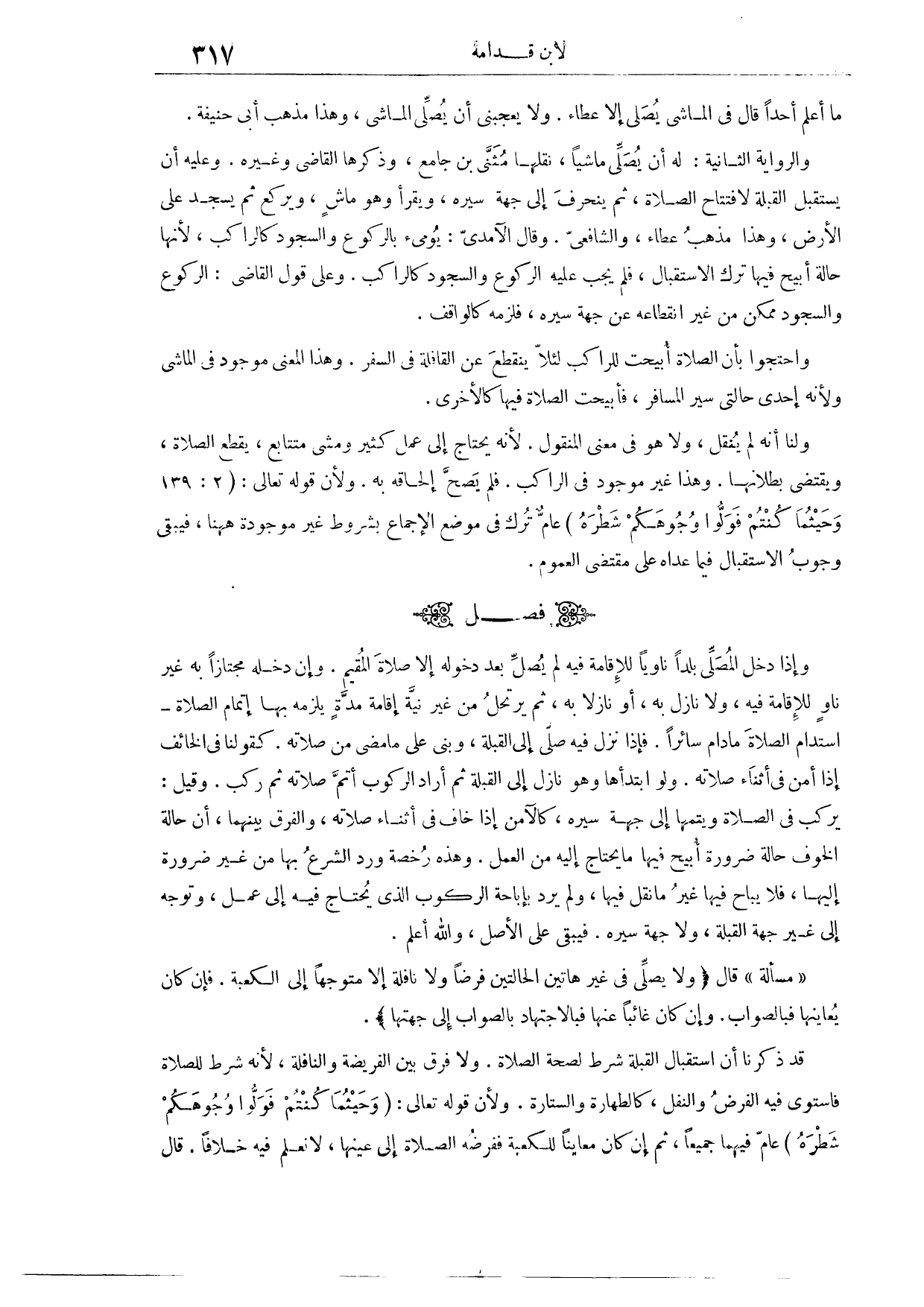 (٦١١) فَصْلٌ: وَإِذَا دَخَلَ الْمُصَلِّي بَلَدًا نَاوِيًا لِلْإِقَامَةِ فِيهِ، لَمْ يُصَلِّ بَعْدَ دُخُولِهِ إلَيْهِ إلَّا صَلَاةَ الْمُقِيمِ. وَإِنْ دَخَلَهُ مُجْتَازًا بِهِ، غَيْرَ نَاوٍ لِلْإِقَامَةِ فِيهِ، وَلَا نَازِلٍ بِهِ، أَوْ نَازِلًا بِهِ، ثُمَّ يَرْتَحِلُ مِنْ غَيْرِ نِيَّةِ إقَامَةِ مُدَّةٍ يَلْزَمُهُ بِهَا إتْمَامُ الصَّلَاةِ، اسْتَدَامَ الصَّلَاةَ مَا دَامَ سَائِرًا، فَإِذَا نَزَلَ فِيهِ صَلَّى إلَى الْقِبْلَةِ، وَبَنَى عَلَى مَا مَضَى مِنْ صَلَاتِهِ، كَقَوْلِنَا فِي الْخَائِفِ إذَا أَمِنَ فِي أَثْنَاءِ صَلَاتِهِ. وَلَوْ ابْتَدَأَهَا، وَهُوَ نَازِلٌ إلَى الْقِبْلَةِ، ثُمَّ أَرَادَ الرُّكُوبَ، أَتَمَّ صَلَاتَهُ، ثُمَّ رَكِبَ. وَقِيلَ: يَرْكَبُ فِي الصَّلَاةِ وَيُتِمُّهَا إلَى جِهَةِ سَيْرِهِ، كَالْآمِنِ إذَا خَافَ فِي أَثْنَاءِ صَلَاتِهِ.