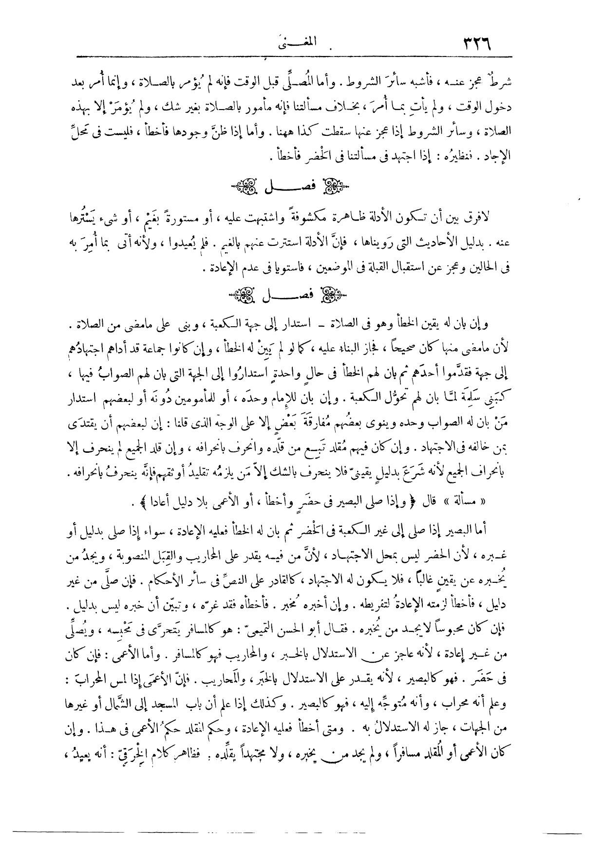 (٦٢٩) فَصْلٌ: وَلَا فَرْقَ بَيْنَ أَنْ تَكُونَ الْأَدِلَّةُ ظَاهِرَةً مَكْشُوفَةً فَاشْتَبَهَتْ عَلَيْهِ، أَوْ مَسْتُورَةً بِغَيْمٍ أَوْ شَيْءٍ يَسْتُرُهَا عَنْهُ، بِدَلِيلِ الْأَحَادِيثِ الَّتِي رَوَيْنَاهَا، فَإِنَّ الْأَدِلَّةَ اسْتَتَرَتْ عَنْهُمْ بِالْغَيْمِ، فَلَمْ يُعِيدُوا، وَلِأَنَّهُ أَتَى بِمَا أُمِرَ بِهِ فِي الْحَالَيْنِ، وَعَجَزَ عَنْ اسْتِقْبَالِ الْقِبْلَةِ فِي الْمَوْضِعَيْنِ، فَاسْتَوَيَا فِي عَدَمِ الْإِعَادَةِ.