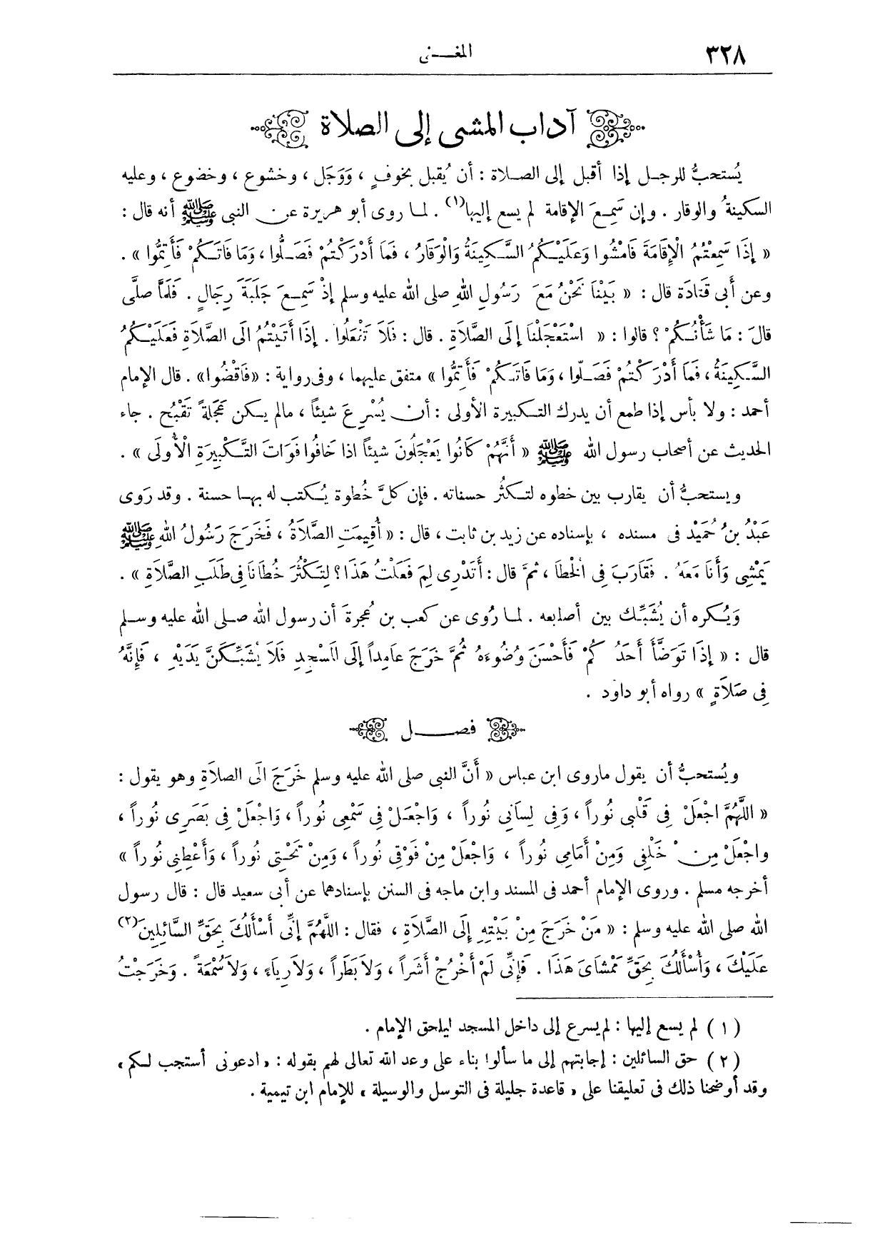 (٦٣٣) فَصْلٌ: وَيُسْتَحَبُّ أَنْ يَقُولَ مَا رَوَى ابْنُ عَبَّاسٍ، «أَنَّ النَّبِيَّ - صَلَّى اللَّهُ عَلَيْهِ وَسَلَّمَ - خَرَجَ إلَى الصَّلَاةِ وَهُوَ يَقُولُ: اللَّهُمَّ اجْعَلْ فِي قَلْبِي نُورًا، وَفِي لِسَانِي نُورًا، وَاجْعَلْ فِي سَمْعِي نُورًا، وَاجْعَلْ فِي بَصَرِي نُورًا، وَاجْعَلْ مِنْ خَلْفِي نُورًا، وَمِنْ أَمَامِي نُورًا، وَاجْعَلْ مِنْ فَوْقِي نُورًا، وَمِنْ تَحْتِي نُورًا، وَأَعْطِنِي نُورًا» . أَخْرَجَهُ مُسْلِمٌ.