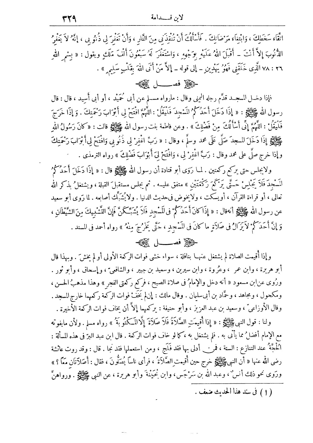 (٦٣٤) فَصْلٌ: فَإِذَا دَخَلَ الْمَسْجِدَ قَدَّمَ رِجْلَهُ الْيُمْنَى وَقَالَ مَا رَوَاهُ مُسْلِمٌ، عَنْ أَبِي حُمَيْدٍ، أَوْ أَبِي أُسَيْدَ قَالَ: قَالَ رَسُولُ اللَّهِ - صَلَّى اللَّهُ عَلَيْهِ وَسَلَّمَ -: «إذَا دَخَلَ أَحَدُكُمْ الْمَسْجِدَ فَلْيَقُلْ: اللَّهُمَّ افْتَحْ لِي أَبْوَابَ رَحْمَتِكَ. وَإِذَا خَرَجَ فَلْيَقُلْ: اللَّهُمَّ إنِّي أَسْأَلُك مِنْ فَضْلِكَ» ، وَعَنْ فَاطِمَةَ بِنْتِ رَسُولِ اللَّهِ - صَلَّى اللَّهُ عَلَيْهِ وَسَلَّمَ - قَالَتْ: «كَانَ رَسُولُ اللَّهِ - صَلَّى اللَّهُ عَلَيْهِ وَسَلَّمَ - إذَا دَخَلَ الْمَسْجِدَ صَلَّى عَلَى مُحَمَّدٍ وَسَلَّمَ، وَقَالَ: رَبِّ اغْفِرْ لِي ذُنُوبِي، وَافْتَحْ لِي أَبْوَابَ رَحْمَتِك، وَإِذَا خَرَجَ صَلَّى عَلَى مُحَمَّدٍ، وَقَالَ: رَبِّ اغْفِرْ لِي، وَافْتَحْ لِي أَبْوَابَ فَضْلِكَ» . رَوَاهُ التِّرْمِذِيُّ.
