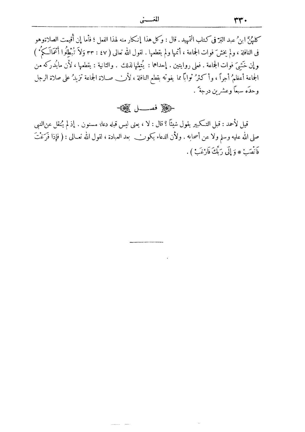 كُلَّهُنَّ ابْنُ عَبْدِ الْبَرِّ فِي كِتَابِ " التَّمْهِيدِ ". قَالَ: وَكُلُّ هَذَا إنْكَارٌ مِنْهُ لِهَذَا الْفِعْلِ. فَأَمَّا إنْ أُقِيمَتْ الصَّلَاةُ وَهُوَ فِي النَّافِلَةِ، وَلَمْ يَخْشَ فَوَاتَ الْجَمَاعَةِ، أَتَمَّهَا، وَلَمْ يَقْطَعْهَا؛ لِقَوْلِ اللَّهِ تَعَالَى: {وَلا تُبْطِلُوا أَعْمَالَكُمْ} [محمد: ٣٣] . وَإِنْ خَشِيَ فَوَاتَ الْجَمَاعَةِ، فَعَلَى رِوَايَتَيْنِ؛ إحْدَاهُمَا، يُتِمُّهَا؛ لِذَلِكَ.