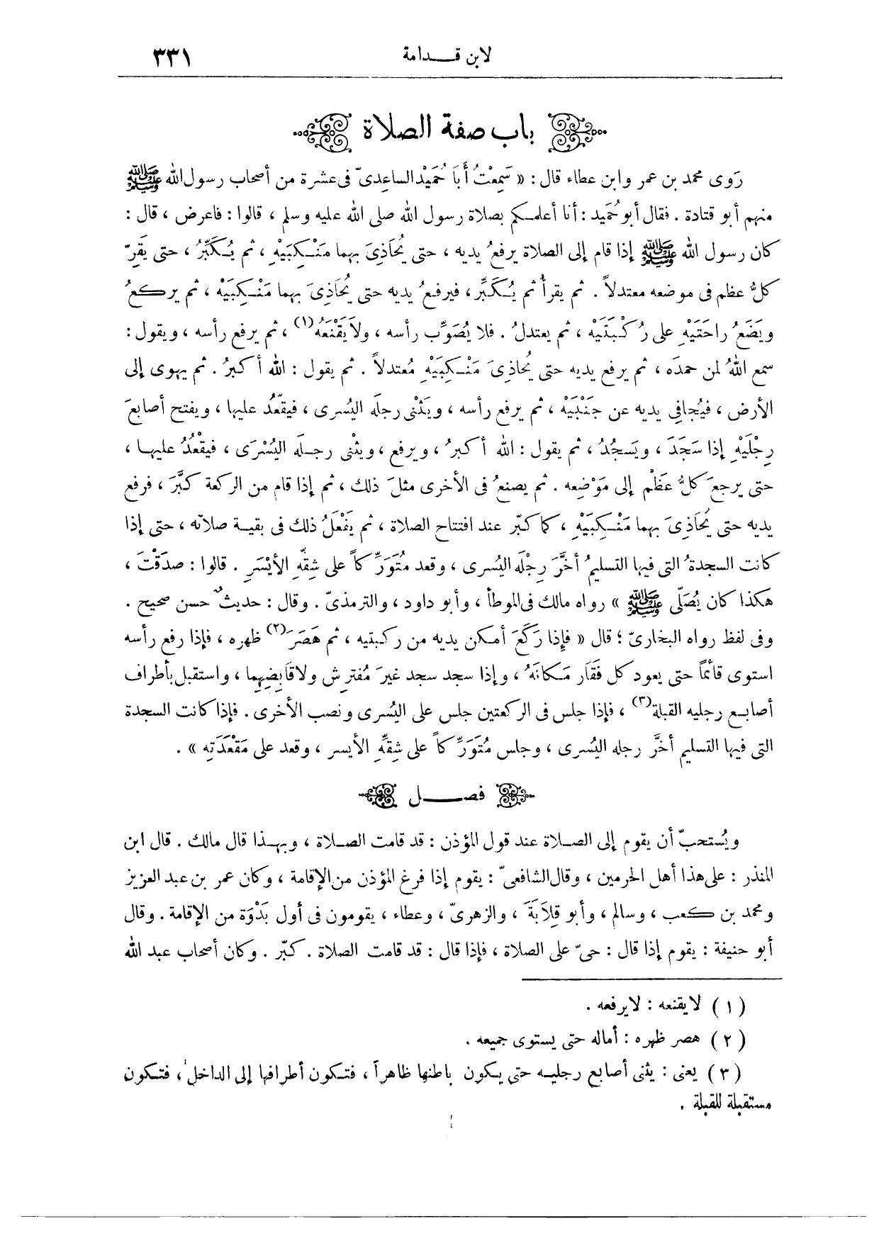 قَالَ: «كَانَ رَسُولُ اللَّهِ - صَلَّى اللَّهُ عَلَيْهِ وَسَلَّمَ - إذَا قَامَ إلَى الصَّلَاةِ يَرْفَعُ يَدَيْهِ، حَتَّى يُحَاذِيَ بِهِمَا مَنْكِبَيْهِ، ثُمَّ يُكَبِّرُ، حَتَّى يَقِرَّ كُلُّ عَظْمٍ فِي مَوْضِعِهِ مُعْتَدِلًا. ثُمَّ يَقْرَأُ، ثُمَّ يُكَبِّرُ، فَيَرْفَعُ يَدَيْهِ حَتَّى يُحَاذِيَ بِهِمَا مَنْكِبَيْهِ، ثُمَّ يَرْكَعُ، وَيَضَعُ رَاحَتَيْهِ عَلَى رُكْبَتَيْهِ، ثُمَّ يَعْتَدِلُ، فَلَا يُصَوِّبُ رَأْسَهُ وَلَا يُقْنِعُهُ، ثُمَّ يَرْفَعُ رَأْسَهُ، وَيَقُولُ: سَمِعَ اللَّهُ لِمَنْ حَمِدَهُ. ثُمَّ يَرْفَعُ يَدَيْهِ حَتَّى يُحَاذِيَ مَنْكِبَيْهِ مُعْتَدِلًا، ثُمَّ يَقُولُ: اللَّهُ أَكْبَرُ. ثُمَّ يَهْوِي إلَى الْأَرْضِ، فَيُجَافِي يَدَيْهِ عَنْ جَنْبَيْهِ، ثُمَّ يَرْفَعُ رَأْسَهُ، وَيُثْنِي رِجْلَهُ الْيُسْرَى فَيَقْعُدُ عَلَيْهَا، وَيَفْتَحُ أَصَابِعَ رِجْلَيْهِ إذَا سَجَدَ، وَيَسْجُدُ، ثُمَّ يَقُولُ: اللَّهُ أَكْبَرُ، وَيَرْفَعُ وَيُثْنِي رِجْلَهُ الْيُسْرَى، فَيَقْعُدُ عَلَيْهَا، حَتَّى يَرْجِعَ كُلُّ عَظْمٍ إلَى مَوْضِعِهِ، ثُمَّ يَصْنَعُ فِي الْأُخْرَى مِثْلَ ذَلِكَ، ثُمَّ إذَا قَامَ مِنْ الرَّكْعَةِ كَبَّرَ، فَرَفَعَ يَدَيْهِ حَتَّى يُحَاذِيَ بِهِمَا مَنْكِبَيْهِ، كَمَا كَبَّرَ عِنْدَ افْتِتَاحِ الصَّلَاةِ، ثُمَّ يَفْعَلُ ذَلِكَ فِي بَقِيَّةِ صَلَاتِهِ، حَتَّى إذَا كَانَتْ السَّجْدَةُ الَّتِي فِيهَا التَّسْلِيمُ أَخَّرَ رِجْلَهُ الْيُسْرَى، وَقَعَدَ مُتَوَرِّكًا عَلَى شِقِّهِ الْأَيْسَرِ. قَالُوا: صَدَقْتَ، هَكَذَا كَانَ يُصَلِّي - صَلَّى اللَّهُ عَلَيْهِ وَسَلَّمَ -» . رَوَاهُ مَالِكٌ فِي الْمُوَطَّأِ، وَأَبُو دَاوُد، وَالتِّرْمِذِيُّ. وَقَالَ: حَدِيثٌ حَسَنٌ صَحِيحٌ.