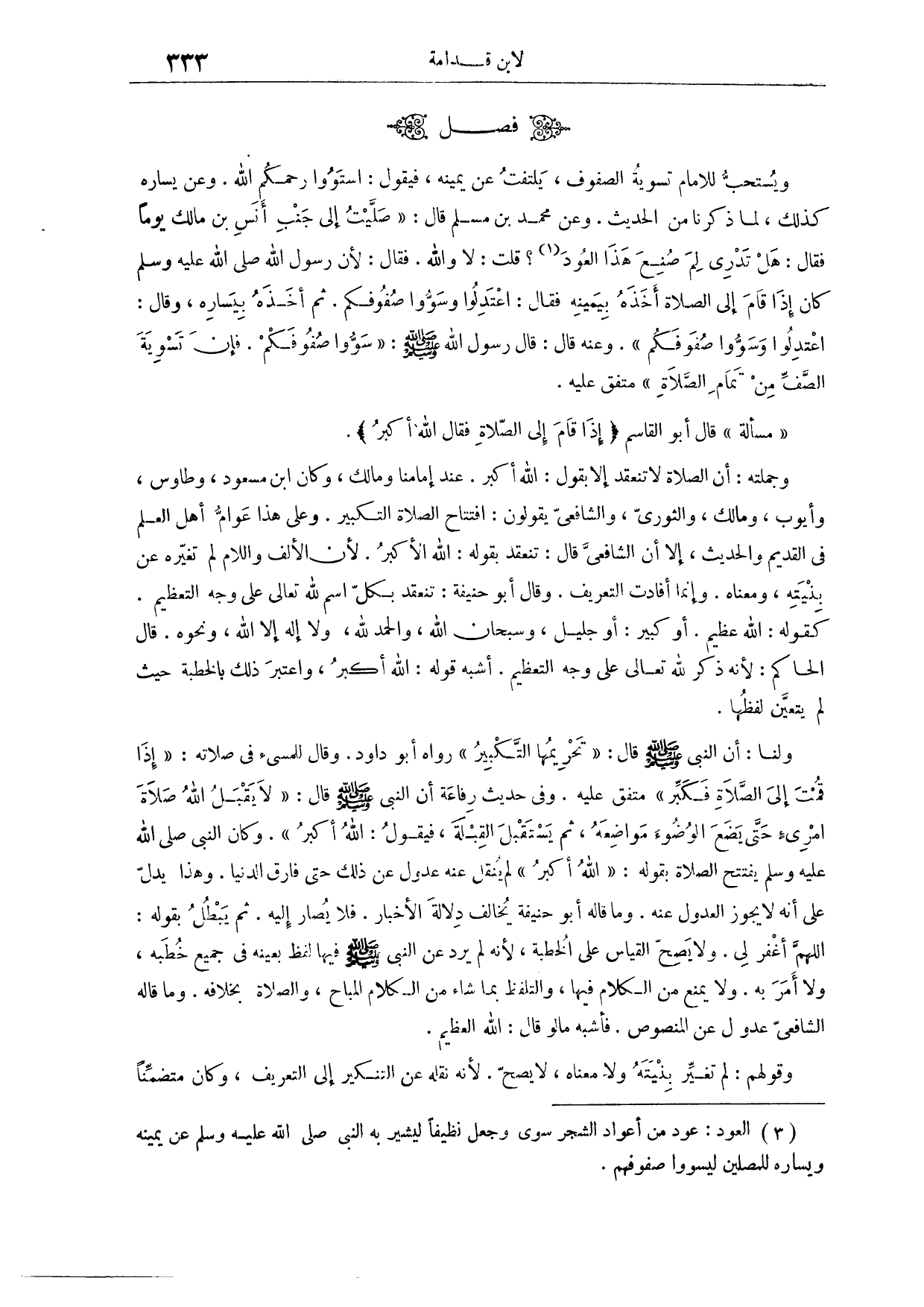 (٦٣٨) فَصْلٌ: وَيُسْتَحَبُّ لِلْإِمَامِ تَسْوِيَةُ الصُّفُوفِ، يَلْتَفِتُ عَنْ يَمِينِهِ، فَيَقُولُ: اسْتَوُوا. رَحِمَكُمْ اللَّهُ. وَعَنْ يَسَارِهِ كَذَلِكَ؛ لِمَا ذَكَرْنَا مِنْ الْحَدِيثِ، وَعَنْ مُحَمَّدِ بْنِ مُسْلِمٍ، قَالَ: «صَلَّيْت إلَى جَنْبِ أَنَسِ بْنِ مَالِكٍ يَوْمًا، فَقَالَ: هَلْ تَدْرِي لِمَ صُنِعَ هَذَا الْعُودُ؟ قُلْت: لَا وَاَللَّهِ. فَقَالَ: لِأَنَّ رَسُولَ اللَّهِ - صَلَّى اللَّهُ عَلَيْهِ وَسَلَّمَ - كَانَ إذَا قَامَ إلَى الصَّلَاةِ أَخَذَهُ بِيَمِينِهِ، فَقَالَ: اعْتَدِلُوا، وَسَوُّوا صُفُوفَكُمْ. ثُمَّ أَخَذَهُ بِيَسَارِهِ، وَقَالَ: اعْتَدِلُوا، وَسَوُّوا صُفُوفَكُمْ» . رَوَاهُ أَبُو دَاوُد. وَعَنْهُ قَالَ: قَالَ رَسُولُ اللَّهِ - صَلَّى اللَّهُ عَلَيْهِ وَسَلَّمَ -: «سَوُّوا صُفُوفَكُمْ، فَإِنَّ تَسْوِيَةَ الصَّفِّ مِنْ تَمَامِ الصَّلَاةِ» . مُتَّفَقٌ عَلَيْهِ.