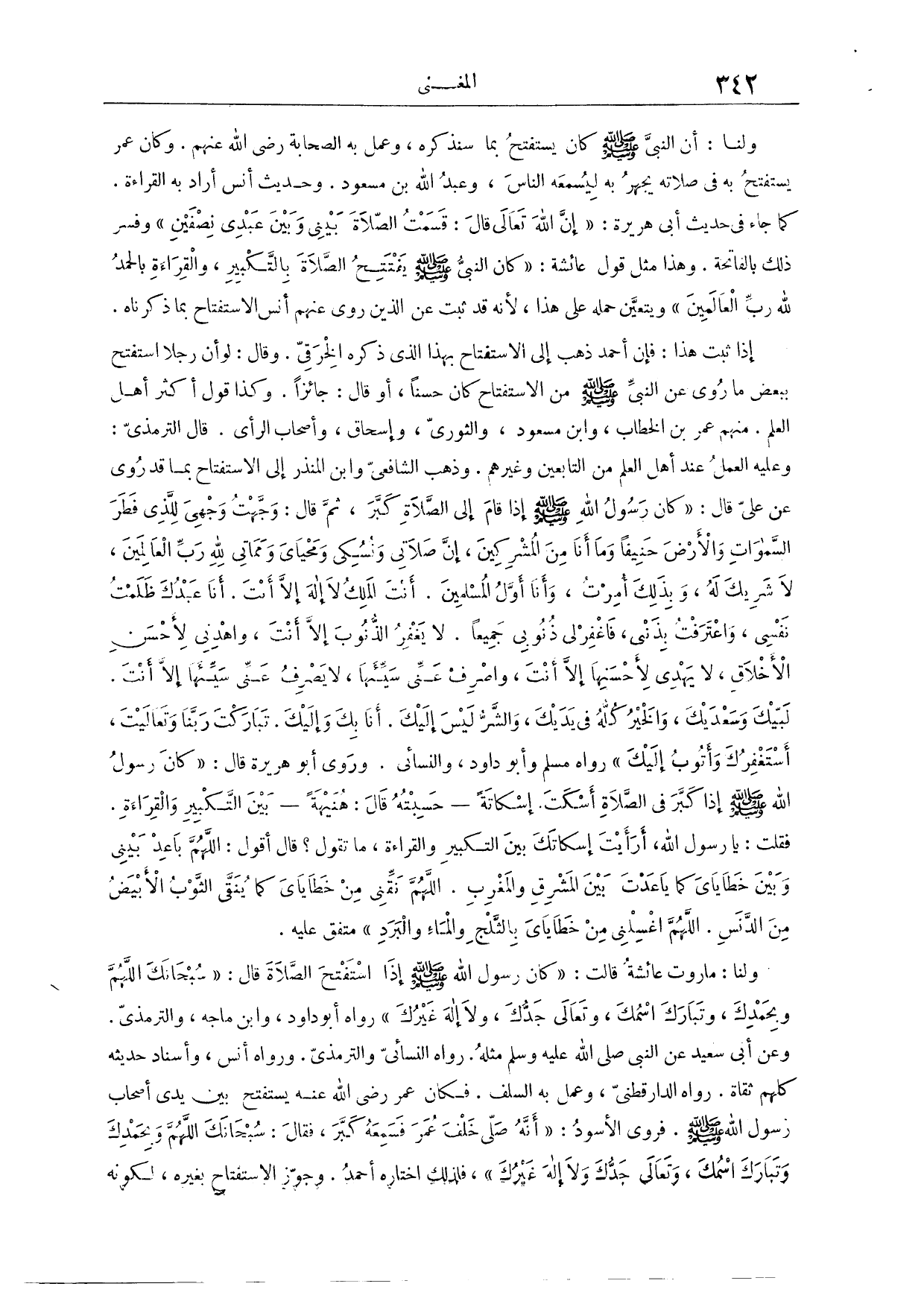 وَلَنَا، مَا رَوَتْ عَائِشَةُ، قَالَتْ: «كَانَ رَسُولُ اللَّهِ - صَلَّى اللَّهُ عَلَيْهِ وَسَلَّمَ - إذَا اسْتَفْتَحَ الصَّلَاةَ، قَالَ: سُبْحَانَكَ اللَّهُمَّ، وَبِحَمْدِكَ، وَتَبَارَكَ اسْمُكَ، وَتَعَالَى جَدُّكَ، وَلَا إلَهَ غَيْرُكَ.» رَوَاهُ أَبُو دَاوُد، وَابْنُ مَاجَهْ وَالتِّرْمِذِيُّ. وَعَنْ أَبِي سَعِيدٍ عَنْ النَّبِيِّ - صَلَّى اللَّهُ عَلَيْهِ وَسَلَّمَ - مِثْلُهُ. رَوَاهُ النَّسَائِيّ وَالتِّرْمِذِيُّ. وَرَوَاهُ أَنَسٌ، وَإِسْنَادُ حَدِيثِهِ كُلُّهُمْ ثِقَاتٌ. رَوَاهُ الدَّارَقُطْنِيّ وَعَمِلَ بِهِ السَّلَفُ وَكَانَ عُمَرُ - رَضِيَ اللَّهُ عَنْهُ - يَسْتَفْتِحُ بِهِ بَيْنَ يَدَيْ أَصْحَابِ رَسُولِ اللَّهِ - صَلَّى اللَّهُ عَلَيْهِ وَسَلَّمَ - فَرَوَى الْأَسْوَدُ، أَنَّهُ صَلَّى خَلْفَ عُمَرَ، فَسَمِعَهُ كَبَّرَ، فَقَالَ: سُبْحَانَكَ اللَّهُمَّ وَبِحَمْدِكَ، وَتَبَارَكَ اسْمُكَ، وَتَعَالَى جَدُّكَ، وَلَا إلَهَ غَيْرُكَ.