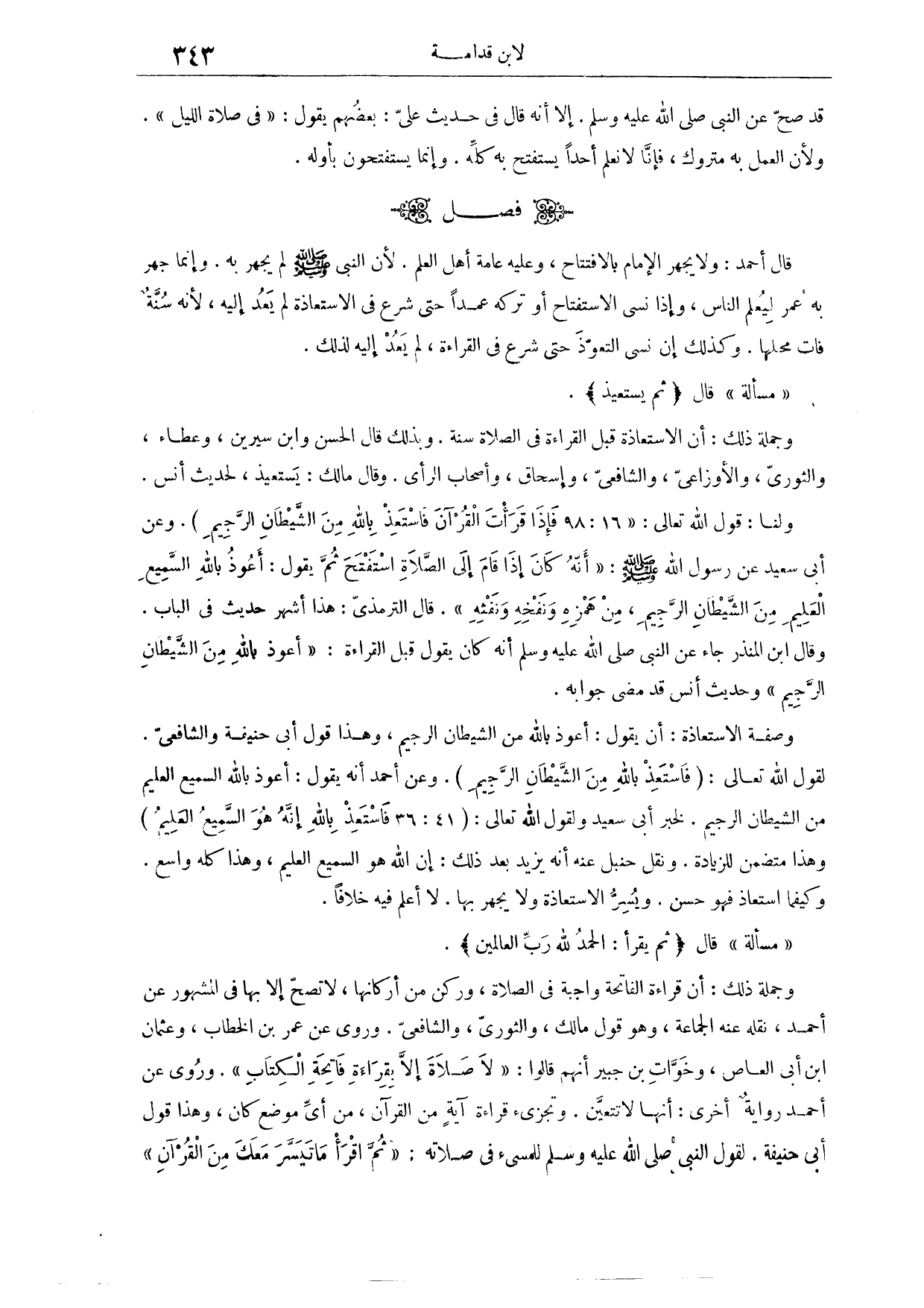 وَصِفَةُ الِاسْتِعَاذَةِ: أَنْ يَقُولَ: أَعُوذُ بِاَللَّهِ مِنْ الشَّيْطَانِ الرَّجِيمِ. وَهَذَا قَوْلُ أَبِي حَنِيفَةَ وَالشَّافِعِيِّ؛ لِقَوْلِ اللَّهِ تَعَالَى {فَاسْتَعِذْ بِاللَّهِ مِنَ الشَّيْطَانِ الرَّجِيمِ} [النحل: ٩٨] وَعَنْ أَحْمَدَ أَنَّهُ يَقُولُ؛ أَعُوذُ بِاَللَّهِ السَّمِيعِ الْعَلِيمِ مِنْ الشَّيْطَانِ الرَّجِيمِ؛ لِخَبَرِ أَبِي سَعِيدٍ وَلِقَوْلِ اللَّهِ تَعَالَى {فَاسْتَعِذْ بِاللَّهِ إِنَّهُ هُوَ السَّمِيعُ الْعَلِيمُ} [فصلت: ٣٦] وَهَذَا مُتَضَمِّنٌ لَزِيَادَةٍ، وَنَقَلَ حَنْبَلٌ عَنْهُ: أَنَّهُ يَزِيدُ بَعْدَ ذَلِكَ: إنَّ اللَّهَ هُوَ السَّمِيعُ الْعَلِيمُ. وَهَذَا كُلُّهُ وَاسِعٌ، وَكَيْفَمَا اسْتَعَاذَ فَهُوَ حَسَنٌ، وَيُسِرُّ الِاسْتِعَاذَةَ، وَلَا يَجْهَرُ بِهَا، لَا أَعْلَمُ فِيهِ خِلَافًا.