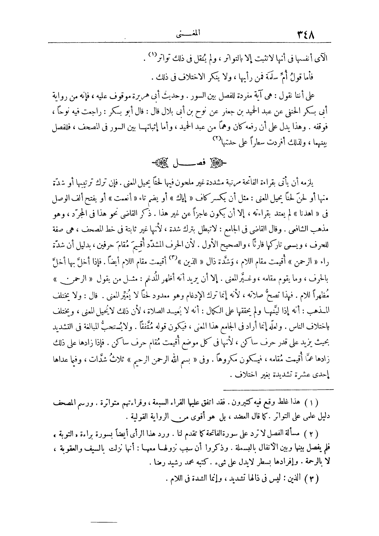 فَصْلٌ: يَلْزَمُهُ أَنْ يَأْتِيَ بِقِرَاءَةِ الْفَاتِحَةِ مُرَتَّبَةً مُشَدَّدَةً، غَيْرَ مَلْحُونٍ فِيهَا لَحْنًا يُحِيلُ الْمَعْنَى، فَإِنْ تَرَكَ تَرْتِيبَهَا، أَوْ شَدَّةً مِنْهَا، أَوْ لَحَنَ لَحْنًا يُحِيلُ الْمَعْنَى، مِثْلُ أَنْ يَكْسِرَ كَافَ (إيَّاكَ) ، أَوْ يَضُمَّ تَاءَ (أَنْعَمْتَ) ، أَوْ يَفْتَحَ أَلِفَ الْوَصْلِ فِي (اهْدِنَا) ، لَمْ يَعْتَدَّ بِقِرَاءَتِهِ، إلَّا أَنْ يَكُونَ عَاجِزًا عَنْ غَيْرِ هَذَا. ذَكَرَ الْقَاضِي نَحْوَ هَذَا فِي (الْمُجَرَّدِ) ، وَهُوَ مَذْهَبُ الشَّافِعِيِّ. وَقَالَ الْقَاضِي فِي (الْجَامِعِ) : لَا تَبْطُلُ بِتَرْكِ شَدَّةٍ؛ لِأَنَّهَا غَيْرُ ثَابِتَةٍ فِي خَطِّ الْمُصْحَفِ، هِيَ صِفَةٌ لِلْحَرْفِ، وَيُسَمَّى تَارِكُهَا قَارِئًا.