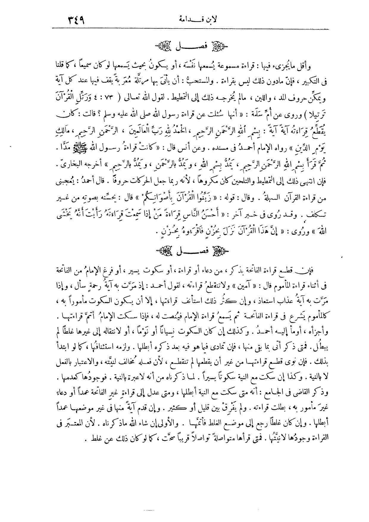 (٦٧١) فَصْلٌ: وَأَقَلُّ مَا يُجْزِئُ فِيهَا قِرَاءَةٌ مَسْمُوعَةٌ، يُسْمِعُهَا نَفْسَهُ، أَوْ يَكُونُ بِحَيْثُ يَسْمَعُهَا لَوْ كَانَ سَمِيعًا، كَمَا قُلْنَا فِي التَّكْبِيرِ، فَإِنَّ مَا دُونَ ذَلِكَ لَيْسَ بِقِرَاءَةٍ. وَالْمُسْتَحَبُّ أَنْ يَأْتِيَ بِهَا مُرَتَّلَةً مُعْرَبَةً، يَقِفُ فِيهَا عِنْدَ كُلِّ آيَةٍ، وَيُمَكِّنُ حُرُوفَ الْمَدِّ وَاللِّينِ، مَا لَمْ يُخْرِجْهُ ذَلِكَ إلَى التَّمْطِيطِ؛ لِقَوْلِ اللَّهِ تَعَالَى: {وَرَتِّلِ الْقُرْآنَ تَرْتِيلا} [المزمل: ٤] . وَرُوِيَ عَنْ أُمِّ سَلَمَةَ، «أَنَّهَا سُئِلَتْ عَنْ قِرَاءَةِ رَسُولِ اللَّهِ - صَلَّى اللَّهُ عَلَيْهِ وَسَلَّمَ - قَالَتْ: كَانَ يُقَطِّعُ قِرَاءَتَهُ آيَةً آيَةً: بِسْمِ اللَّهِ الرَّحْمَنِ الرَّحِيمِ الْحَمْدُ لِلَّهِ رَبِّ الْعَالَمِينَ الرَّحْمَنِ الرَّحِيمِ مَالِكِ يَوْمِ الدِّينِ» . رَوَاهُ الْإِمَامُ أَحْمَدُ، فِي (مُسْنَدِهِ) وَعَنْ أَنَسٍ، قَالَ: «كَانَتْ قِرَاءَةُ رَسُولِ اللَّهِ - صَلَّى اللَّهُ عَلَيْهِ وَسَلَّمَ - مَدًّا ثُمَّ قَرَأَ بِسْمِ اللَّهِ الرَّحْمَنِ الرَّحِيمِ. يَمُدُّ بِسْمِ اللَّهِ، وَيَمُدُّ بِالرَّحْمَنِ، وَيَمُدُّ بِالرَّحِيمِ.» أَخْرَجَهُ الْبُخَارِيُّ. فَإِنْ انْتَهَى ذَلِكَ إلَى التَّمْطِيطِ وَالتَّلْحِينِ كَانَ مَكْرُوهًا؛ لِأَنَّهُ رُبَّمَا جَعَلَ الْحَرَكَاتِ حُرُوفًا. قَالَ أَحْمَدُ: يُعْجِبُنِي مِنْ قِرَاءَةِ الْقُرْآنِ السَّهْلَةُ.