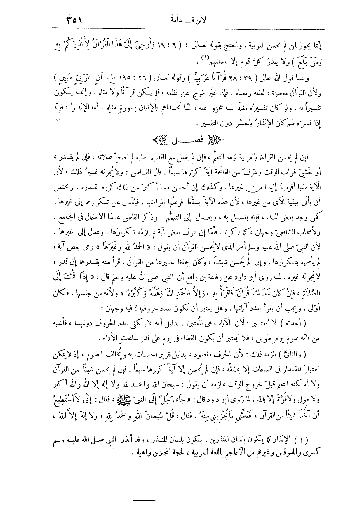 وقَوْله تَعَالَى: {بِلِسَانٍ عَرَبِيٍّ مُبِينٍ} [الشعراء: ١٩٥] . وَلِأَنَّ الْقُرْآنَ مُعْجِزَةٌ؛ لَفْظَهُ، وَمَعْنَاهُ، فَإِذَا غُيِّرَ خَرَجَ عَنْ نَظْمِهِ، فَلَمْ يَكُنْ قُرْآنًا وَلَا مِثْلَهُ، وَإِنَّمَا يَكُونُ تَفْسِيرًا لَهُ، وَلَوْ كَانَ تَفْسِيرُهُ مِثْلَهُ لَمَا عَجَزُوا عَنْهُ لَمَّا تَحَدَّاهُمْ بِالْإِتْيَانِ بِسُورَةٍ مِنْ مِثْلِهِ، أَمَّا الْإِنْذَارُ، فَإِنَّهُ إذَا فَسَّرَهُ لَهُمْ كَانَ الْإِنْذَارُ بِالْمُفَسَّرِ دُونَ التَّفْسِيرِ. (٦٧٥) فَصْلٌ: فَإِنْ لَمْ يُحْسِنْ الْقِرَاءَةَ بِالْعَرَبِيَّةِ، لَزِمَهُ التَّعَلُّمُ، فَإِنْ لَمْ يَفْعَلْ مَعَ الْقُدْرَةِ عَلَيْهِ، لَمْ تَصِحَّ صَلَاتُهُ، فَإِنْ لَمْ يَقْدِرْ أَوْ خَشِيَ فَوَاتَ الْوَقْتِ، وَعَرَفَ مِنْ الْفَاتِحَةِ آيَةً، كَرَّرَهَا سَبْعًا. قَالَ الْقَاضِي: لَا يُجْزِئُهُ غَيْرُ ذَلِكَ؛ لِأَنَّ الْآيَةَ مِنْهَا أَقْرَبُ إلَيْهَا مِنْ غَيْرِهَا.