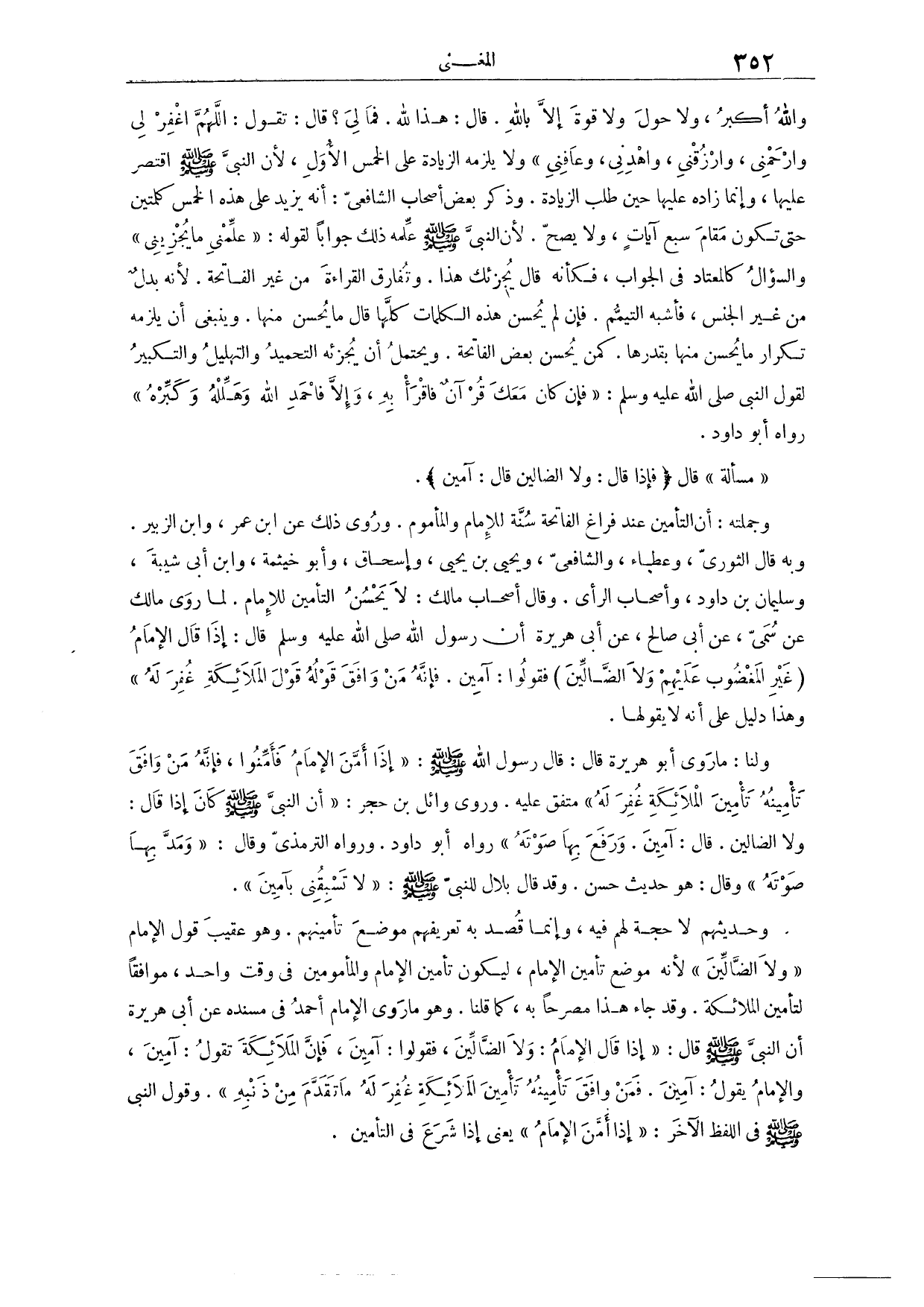 ، وَقَدْ قَالَ بِلَالٌ لِلنَّبِيِّ - صَلَّى اللَّهُ عَلَيْهِ وَسَلَّمَ -: (لَا تَسْبِقْنِي بِآمِينَ) . وَحَدِيثُهُمْ لَا حُجَّةَ لَهُمْ فِيهِ، وَإِنَّمَا قُصِدَ بِهِ تَعْرِيفُهُمْ مَوْضِعَ تَأْمِينِهِمْ، وَهُوَ عَقِيبَ قَوْلِ الْإِمَامِ: (وَلَا الضَّالِّينَ) . لِأَنَّهُ مَوْضِعُ تَأْمِينِ الْإِمَامِ، لِيَكُونَ تَأْمِينُ الْإِمَامِ وَالْمَأْمُومِينَ فِي وَقْتٍ وَاحِدٍ مُوَافِقًا لِتَأْمِينِ الْمَلَائِكَةِ، وَقَدْ جَاءَ هَذَا مُصَرَّحًا بِهِ، كَمَا قُلْنَا، وَهُوَ مَا رُوِيَ عَنْ الْإِمَامِ أَحْمَدَ، فِي " مُسْنَدِهِ ". عَنْ أَبِي هُرَيْرَةَ، «أَنَّ النَّبِيَّ - صَلَّى اللَّهُ عَلَيْهِ وَسَلَّمَ - قَالَ: إذَا قَالَ الْإِمَامُ: وَلَا الضَّالِّينَ. فَقُولُوا: آمِينَ. فَإِنَّ الْمَلَائِكَةَ تَقُولُ: آمِينَ. وَالْإِمَامُ يَقُولُ: آمِينَ. فَمَنْ وَافَقَ تَأْمِينُهُ تَأْمِينَ الْمَلَائِكَةِ غُفِرَ لَهُ مَا تَقَدَّمَ مِنْ ذَنْبِهِ» ، وَقَوْلُ النَّبِيِّ - صَلَّى اللَّهُ عَلَيْهِ وَسَلَّمَ - فِي اللَّفْظِ الْآخَرِ: (إذَا أَمَّنَ الْإِمَامُ) .