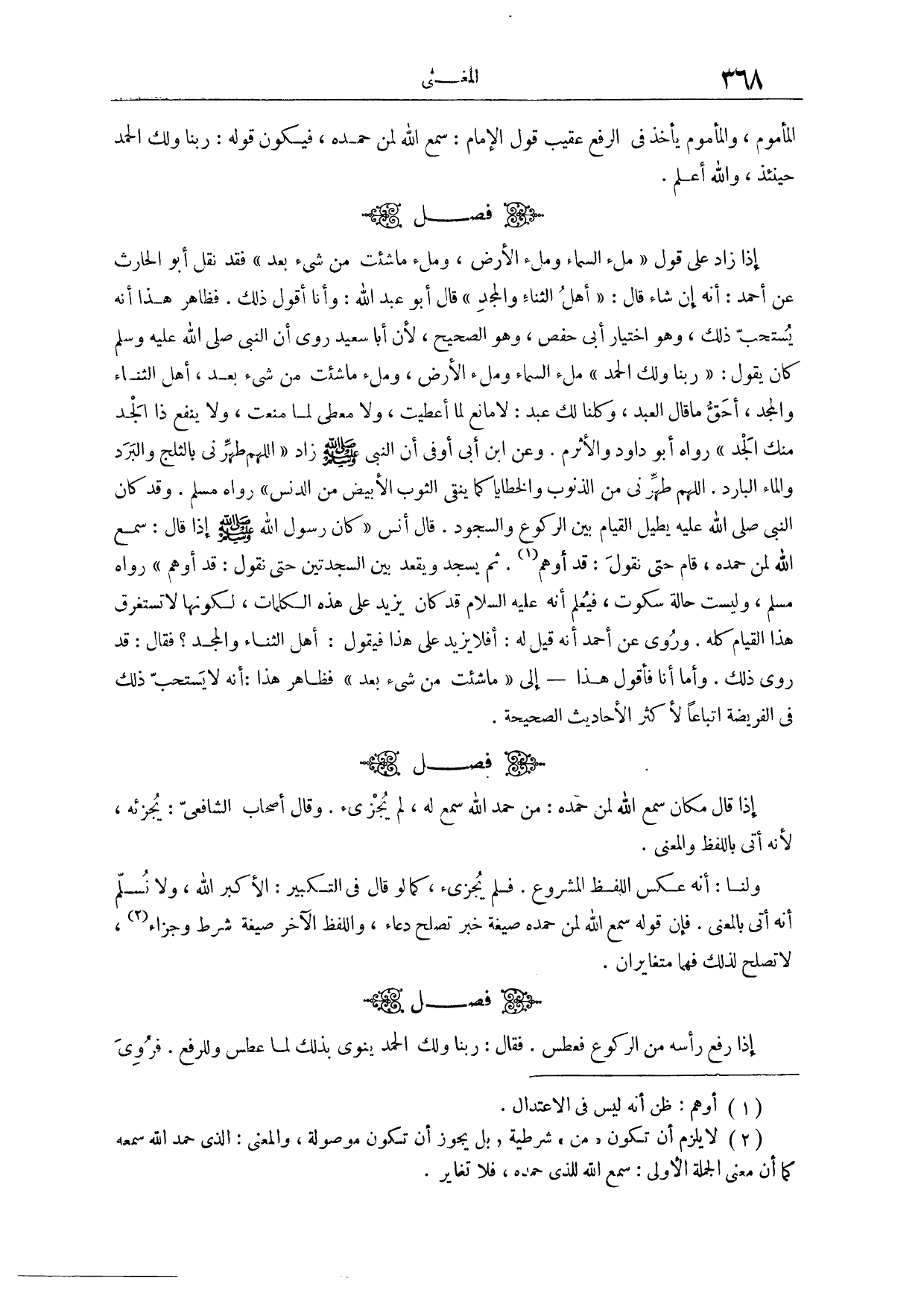 (٧١٠) فَصْلٌ: إذَا زَادَ عَلَى قَوْلِ: " مِلْءَ السَّمَاءِ وَمِلْءَ الْأَرْضِ، وَمِلْءَ مَا شِئْتَ مِنْ شَيْءٍ بَعْدُ "، فَقَدْ نَقَلَ أَبُو الْحَارِثِ، عَنْ أَحْمَدَ أَنَّهُ إنْ شَاءَ قَالَ: أَهْلَ الثَّنَاءِ وَالْمَجْدِ. قَالَ أَبُو عَبْدِ اللَّهِ: وَأَنَا أَقُولُ ذَلِكَ. فَظَاهِرُ هَذَا أَنَّهُ يُسْتَحَبُّ ذَلِكَ، وَهُوَ اخْتِيَارُ أَبِي حَفْصٍ، وَهُوَ الصَّحِيحُ؛ لِأَنَّ أَبَا سَعِيدٍ رَوَى، أَنَّ النَّبِيَّ - صَلَّى اللَّهُ عَلَيْهِ وَسَلَّمَ - كَانَ يَقُولُ: «رَبَّنَا وَلَك الْحَمْدُ، مِلْءَ السَّمَاءِ وَمِلْءَ الْأَرْضِ، وَمِلْءَ مَا شِئْتَ مِنْ شَيْءٍ بَعْدُ، أَهْلَ الثَّنَاءِ وَالْمَجْدِ، أَحَقُّ مَا قَالَ الْعَبْدُ وَكُلُّنَا لَك عَبْدٌ: لَا مَانِعَ لِمَا أَعْطَيْتَ، وَلَا مُعْطِيَ لِمَا مَنَعْتَ، وَلَا يَنْفَعُ ذَا الْجَدِّ مِنْك الْجَدُّ» . رَوَاهُ أَبُو دَاوُد، وَالْأَثْرَمُ. وَعَنْ ابْنِ أَبِي أَوْفَى، أَنَّ النَّبِيَّ - صَلَّى اللَّهُ عَلَيْهِ وَسَلَّمَ - زَادَ: «اللَّهُمَّ طَهِّرْنِي بِالثَّلْجِ وَالْبَرَدِ وَالْمَاءِ الْبَارِدِ، اللَّهُمَّ طَهِّرْنِي مِنْ الذُّنُوبِ وَالْخَطَايَا كَمَا يُنَقَّى الثَّوْبُ الْأَبْيَضُ مِنْ الدَّنَسِ» . رَوَاهُ مُسْلِمٌ