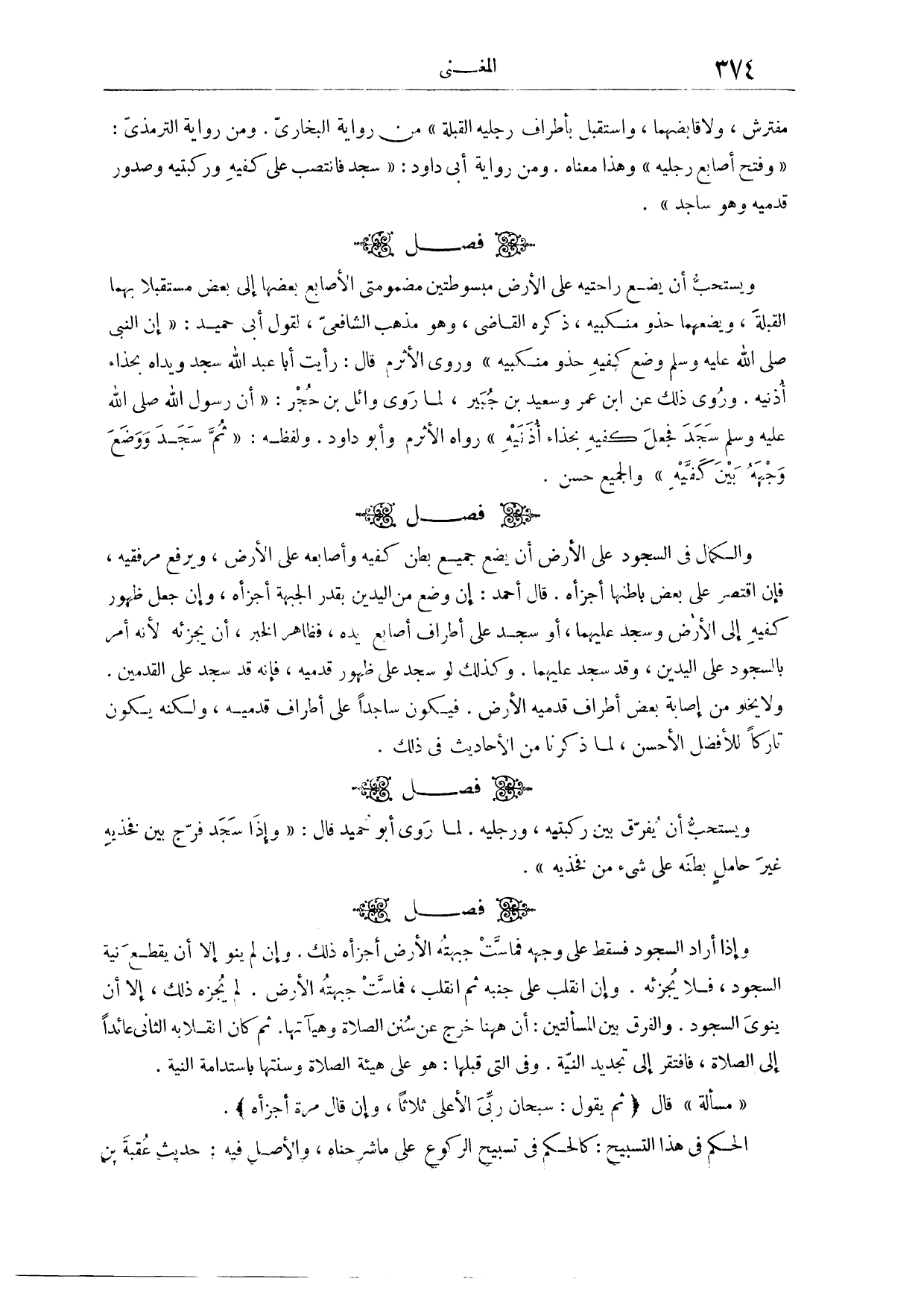 (٧٢٤) فَصْلٌ: وَالْكَمَالُ فِي السُّجُودِ عَلَى الْأَرْضِ أَنْ يَضَعَ جَمِيعَ بَطْنِ كَفَّيْهِ، وَأَصَابِعِهِ عَلَى الْأَرْضِ، وَيَرْفَعَ مِرْفَقَيْهِ، فَإِنْ اقْتَصَرَ عَلَى بَعْضِ بَاطِنِهِمَا، أَجْزَأَهُ. قَالَ أَحْمَدُ: إنْ وَضَعَ مِنْ الْيَدَيْنِ بِقَدْرِ الْجَبْهَةِ، أَجْزَأَهُ.
