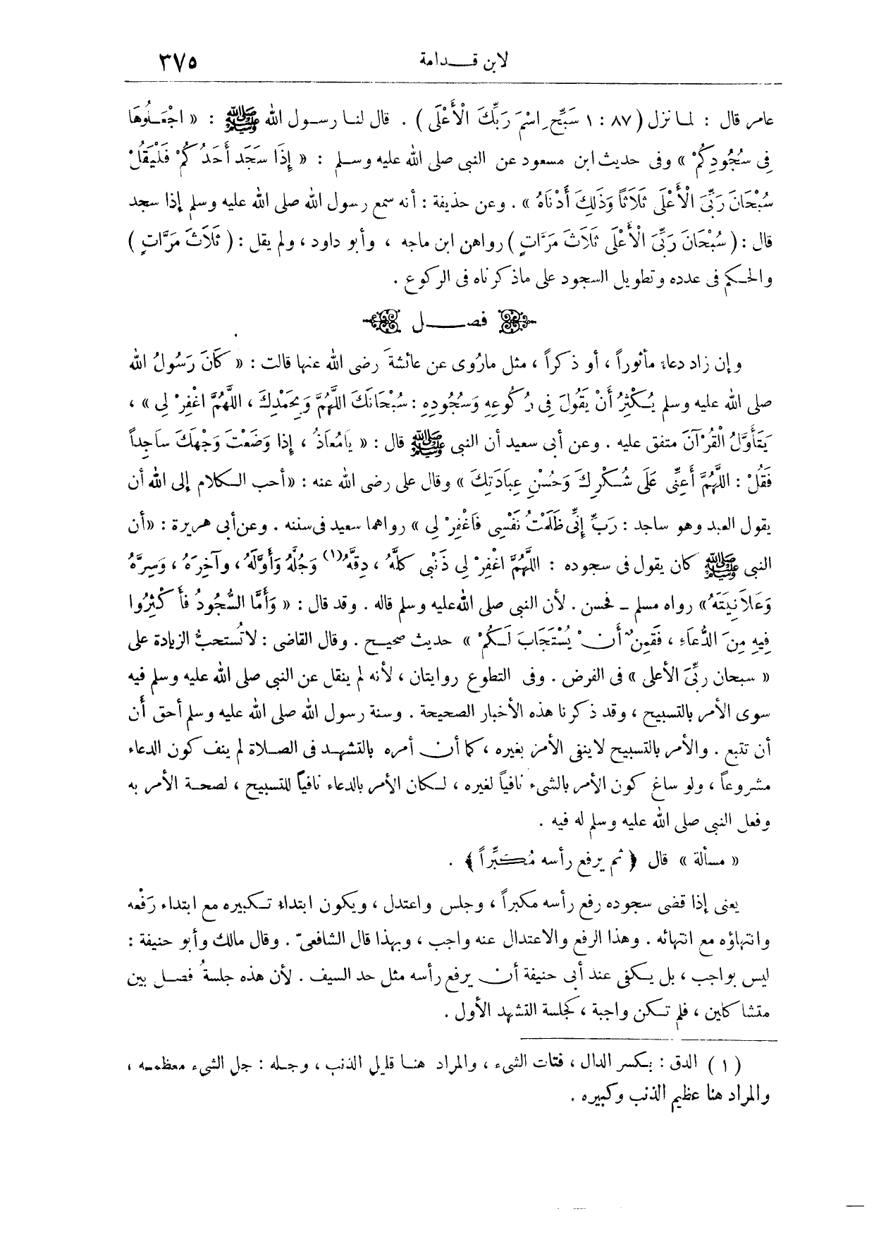 (٧٢٨) فَصْلٌ: وَإِنْ زَادَ دُعَاءً مَأْثُورًا، أَوْ ذِكْرًا - مِثْلُ مَا رُوِيَ عَنْ عَائِشَةَ، - رَضِيَ اللَّهُ عَنْهَا -، قَالَتْ: «كَانَ رَسُولُ اللَّهِ - صَلَّى اللَّهُ عَلَيْهِ وَسَلَّمَ - يُكْثِرُ أَنْ يَقُولَ فِي رُكُوعِهِ وَسُجُودِهِ: سُبْحَانَكَ اللَّهُمَّ وَبِحَمْدِكَ، اللَّهُمَّ اغْفِرْ لِي يَتَأَوَّلُ الْقُرْآنَ.» مُتَّفَقٌ عَلَيْهِ. وَعَنْ أَبِي سَعِيدٍ «. أَنَّ النَّبِيَّ - صَلَّى اللَّهُ عَلَيْهِ وَسَلَّمَ - قَالَ: يَا مُعَاذُ، إذَا وَضَعْتَ وَجْهَكَ سَاجِدًا فَقُلْ: اللَّهُمَّ أَعِنِّي عَلَى شُكْرِكَ وَحُسْنِ عِبَادَتِكَ» .