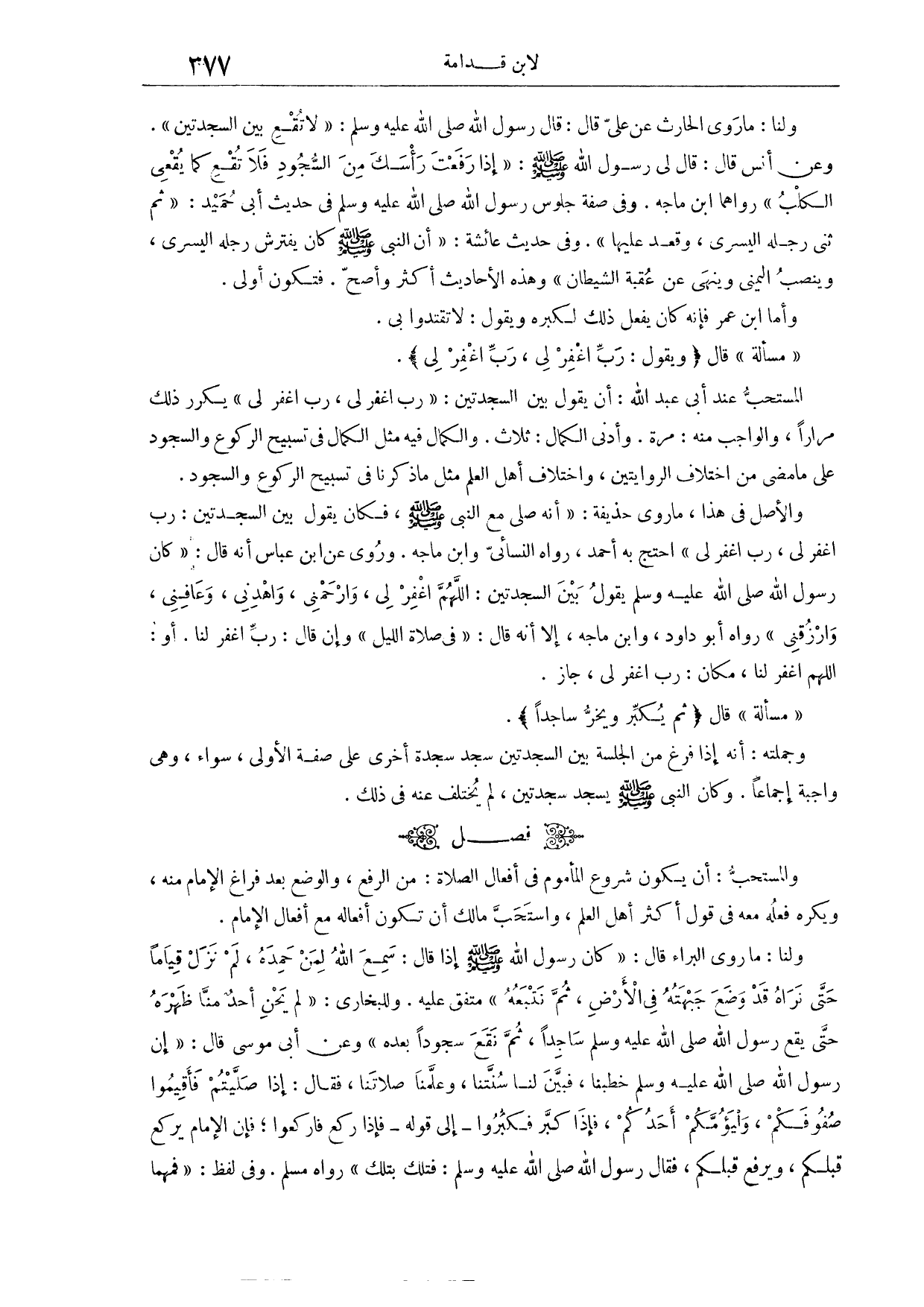 مَسْأَلَةٌ: قَالَ: (وَيَقُولُ: رَبِّ اغْفِرْ لِي رَبِّ اغْفِرْ لِي) الْمُسْتَحَبُّ عِنْدَ أَبِي عَبْدِ اللَّهِ أَنْ يَقُولَ بَيْنَ السَّجْدَتَيْنِ: رَبِّ اغْفِرْ لِي، رَبِّ اغْفِرْ لِي: يُكَرِّرُ ذَلِكَ مِرَارًا، وَالْوَاجِبُ مِنْهُ مَرَّةٌ، وَأَدْنَى الْكَمَالِ ثَلَاثٌ، وَالْكَمَالُ مِنْهُ مِثْلُ الْكَمَالِ فِي تَسْبِيحِ الرُّكُوعِ وَالسُّجُودِ، عَلَى مَا مَضَى مِنْ اخْتِلَافِ الرِّوَايَتَيْنِ، وَاخْتِلَافِ أَهْلِ الْعِلْمِ مِثْلُ مَا ذَكَرْنَا فِي تَسْبِيحِ الرُّكُوعِ وَالسُّجُودِ. وَالْأَصْلُ فِي هَذَا مَا رَوَى حُذَيْفَةُ «، أَنَّهُ صَلَّى مَعَ النَّبِيِّ - صَلَّى اللَّهُ عَلَيْهِ وَسَلَّمَ - فَكَانَ يَقُولُ بَيْنَ السَّجْدَتَيْنِ: رَبِّ اغْفِرْ لِي، رَبِّ اغْفِرْ لِي» . احْتَجَّ بِهِ أَحْمَدُ، رَوَاهُ النَّسَائِيّ، وَابْنُ مَاجَهْ.