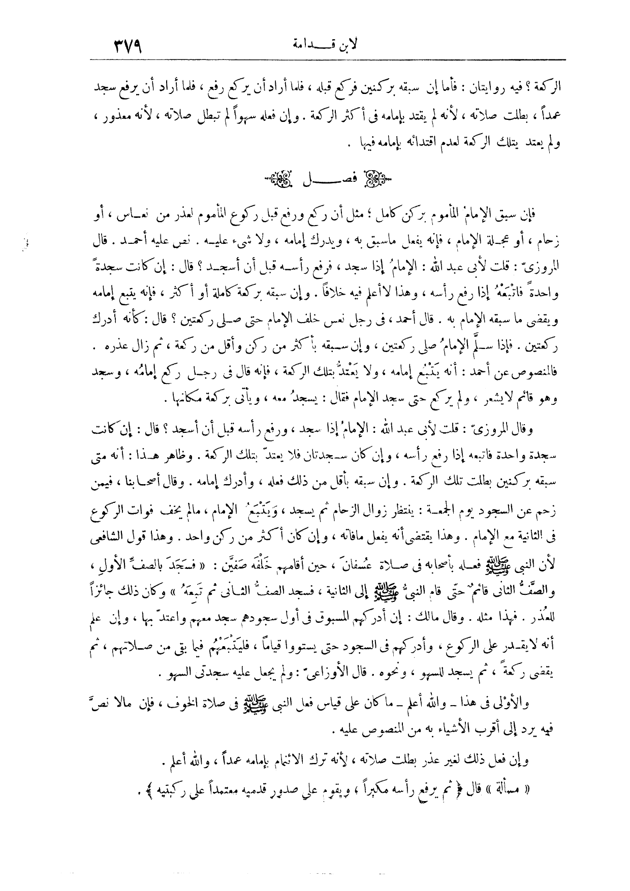 (٧٣٧) فَصْلٌ: فَإِنْ سَبَقَ الْإِمَامُ الْمَأْمُومَ بِرُكْنٍ كَامِلٍ؛ مِثْلُ أَنْ رَكَعَ وَرَفَعَ قَبْلَ رُكُوعِ الْمَأْمُومِ، لِعُذْرٍ مِنْ نُعَاسٍ أَوْ زِحَامٍ أَوْ عَجَلَةِ الْإِمَامِ، فَإِنَّهُ يَفْعَلُ مَا سُبِقَ بِهِ، وَيُدْرِكُ إمَامَهُ، وَلَا شَيْءَ عَلَيْهِ. نَصَّ عَلَيْهِ أَحْمَدُ. قَالَ الْمَرُّوذِيُّ: قُلْت لِأَبِي عَبْدِ اللَّهِ: الْإِمَامُ إذَا سَجَدَ، فَرَفَعَ رَأْسَهُ قَبْلَ أَنْ أَسْجُدَ؟ قَالَ: إنْ كَانَتْ سَجْدَةً وَاحِدَةً فَأَتَّبِعُهُ إذَا رَفَعَ رَأْسَهُ. وَهَذَا لَا أَعْلَمُ فِيهِ خِلَافًا. وَإِنْ سَبَقَهُ بِرَكْعَةٍ كَامِلَةٍ أَوْ أَكْثَرَ، فَإِنَّهُ يَتَّبِعُ إمَامَهُ، وَيَقْضِي مَا سَبَقَهُ الْإِمَامُ بِهِ.