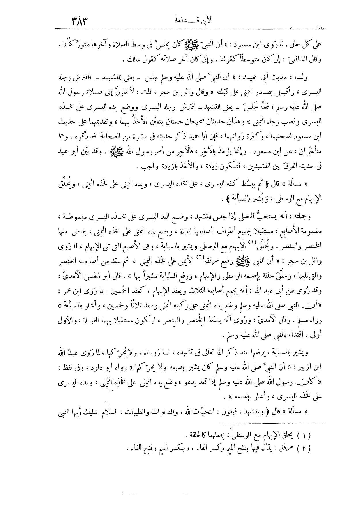 (٧٤٤) مَسْأَلَةٌ: قَالَ: (ثُمَّ يَبْسُطُ كَفَّهُ الْيُسْرَى عَلَى فَخِذِهِ الْيُسْرَى، وَيَدَهُ الْيُمْنَى عَلَى فَخِذِهِ الْيُمْنَى، وَيُحَلِّقُ الْإِبْهَامَ مَعَ الْوُسْطَى؛ وَيُشِيرُ بِالسَّبَّابَةِ) وَجُمْلَتُهُ أَنَّهُ يُسْتَحَبُّ لِلْمُصَلِّي إذَا جَلَسَ لِلتَّشَهُّدِ وَضْعُ الْيَدِ الْيُسْرَى عَلَى فَخِذِ الْيُسْرَى، مَبْسُوطَةً مَضْمُومَةَ الْأَصَابِعِ، مُسْتَقْبِلًا بِجَمِيعِ أَطْرَافِ أَصَابِعِهَا الْقِبْلَةَ، وَيَضَعُ يَدَهُ الْيُمْنَى عَلَى فَخِذِهِ الْيُمْنَى، يَقْبِضُ مِنْهَا الْخِنْصَرَ وَالْبِنْصِرَ، وَيُحَلِّقُ الْإِبْهَامَ مَعَ الْوُسْطَى، وَيُشِيرُ بِالسَّبَّابَةِ، وَهِيَ الْإِصْبَعُ الَّتِي تَلِي الْإِبْهَامَ؛ لِمَا رَوَى وَائِلُ بْنُ حُجْرٌ «، أَنَّ النَّبِيَّ - صَلَّى اللَّهُ عَلَيْهِ وَسَلَّمَ - وَضَعَ مَرْفِقَهُ الْأَيْمَنَ عَلَى فَخِذِهِ الْيُمْنَى، ثُمَّ عَقَدَ مِنْ أَصَابِعِهِ الْخِنْصَرَ وَاَلَّتِي تَلِيهَا، وَحَلَّقَ حَلْقَةً بِإِصْبَعِهِ الْوُسْطَى وَالْإِبْهَامِ، وَرَفَعَ السَّبَّابَةَ مُشِيرًا بِهَا» .