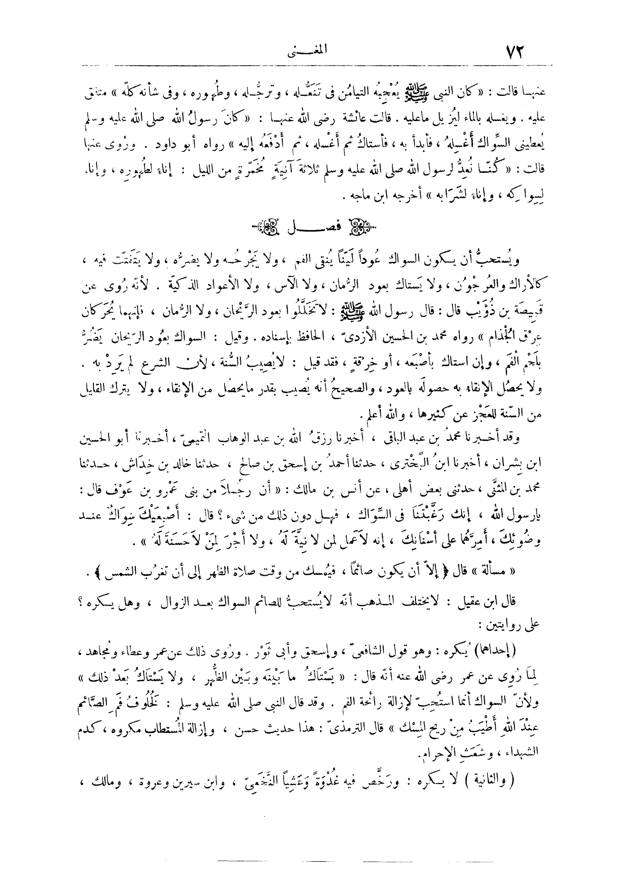 (١١٨) فَصْلٌ: وَيُسْتَحَبُّ أَنْ يَكُونَ السِّوَاكُ عُودًا لَيِّنًا يُنَقِّي الْفَمَ، وَلَا يَجْرَحُهُ، وَلَا يَضُرُّهُ، وَلَا يَتَفَتَّتُ فِيهِ، كَالْأَرَاكِ وَالْعُرْجُونِ، وَلَا يُسْتَاكُ بِعُودِ الرُّمَّانِ وَلَا الْآسِ وَلَا الْأَعْوَادِ الذَّكِيَّةِ؛ لِأَنَّهُ رُوِيَ عَنْ قَبِيصَةَ بْنِ ذُؤَيْبٍ، قَالَ: قَالَ رَسُولُ اللَّهِ - صَلَّى اللَّهُ عَلَيْهِ وَسَلَّمَ -: «لَا تَخَلَّلُوا بِعُودِ الرَّيْحَانِ، وَلَا الرُّمَّانِ، فَإِنَّهُمَا يُحَرِّكَانِ عِرْقَ الْجُذَامِ» . رَوَاهُ مُحَمَّدُ بْنُ الْحُسَيْنِ الْأَزْدِيُّ الْحَافِظُ بِإِسْنَادِهِ، وَقِيلَ: السِّوَاكُ بِعُودِ الرَّيْحَانِ يَضُرُّ بِلَحْمِ الْفَمِ.