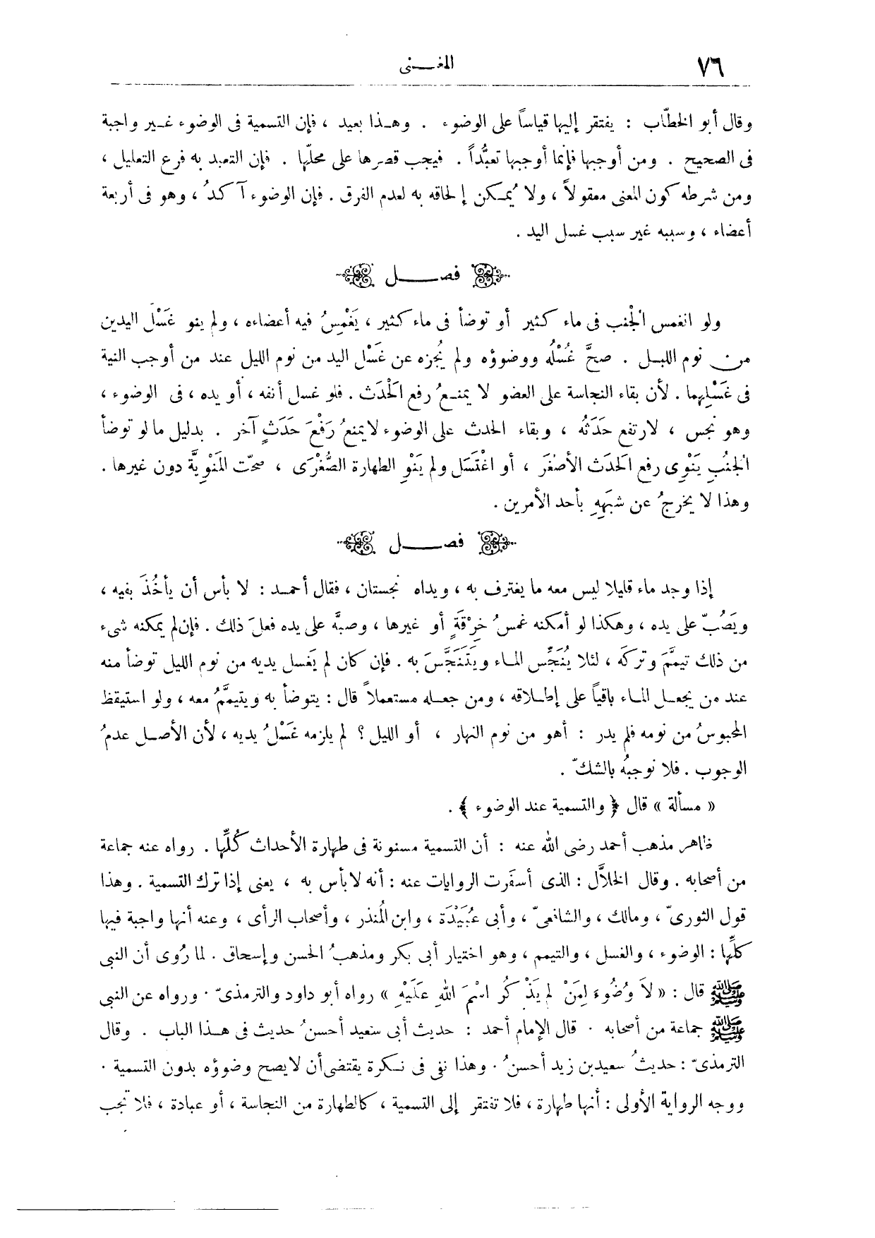 (١٣٠) مَسْأَلَةٌ قَالَ: وَالتَّسْمِيَةُ عِنْدَ الْوُضُوءِ. ظَاهِرُ مَذْهَبِ أَحْمَدَ - رَضِيَ اللَّهُ عَنْهُ -: أَنَّ التَّسْمِيَةَ مَسْنُونَةٌ فِي طَهَارَةِ الْأَحْدَاثِ كُلِّهَا. رَوَاهُ عَنْهُ جَمَاعَةٌ مِنْ أَصْحَابِهِ. وَقَالَ الْخَلَّالُ الَّذِي اسْتَقَرَّتْ الرِّوَايَاتُ عَنْهُ أَنَّهُ لَا بَأْسَ بِهِ. يَعْنِي إذَا تَرَكَ التَّسْمِيَةَ. وَهَذَا قَوْلُ الثَّوْرِيِّ وَمَالِكٍ وَالشَّافِعِيِّ وَأَبِي عُبَيْدَةَ، وَابْنِ الْمُنْذِرِ وَأَصْحَابِ الرَّأْيِ. وَعَنْهُ أَنَّهَا وَاجِبَةٌ فِيهَا كُلِّهَا؛ الْوُضُوءِ، وَالْغُسْلِ، وَالتَّيَمُّمِ.