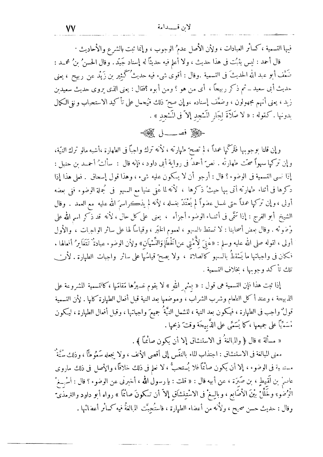 وَقَالَ الْحَسَنُ بْنُ مُحَمَّدٍ: ضَعَّفَ أَبُو عَبْدِ اللَّهِ الْحَدِيثَ فِي التَّسْمِيَةِ، وَقَالَ: أَقْوَى شَيْءٍ فِيهِ حَدِيثُ كَثِيرِ بْنِ زَيْدٍ، عَنْ رُبَيْحٍ - يَعْنِي حَدِيثَ أَبِي سَعِيدٍ - ثُمَّ ذَكَرَ رُبَيْحًا، أَيْ مَنْ هُوَ؟ وَمَنْ أَبُوهُ؟ فَقَالَ: يَعْنِي الَّذِي يَرْوِي حَدِيثَ سَعِيدِ بْنِ زَيْدٍ. يَعْنِي أَنَّهُمْ مَجْهُولُونَ، وَضَعَّفَ إسْنَادَهُ. وَإِنْ صَحَّ ذَلِكَ فَيُحْمَلُ عَلَى تَأْكِيدِ الِاسْتِحْبَابِ وَنَفْيِ الْكَمَالِ بِدُونِهَا، كَقَوْلِهِ: «لَا صَلَاةَ لِجَارِ الْمَسْجِدِ إلَّا فِي الْمَسْجِدِ» . (١٣١) فَصْلٌ: وَإِنْ قُلْنَا بِوُجُوبِهَا فَتَرَكَهَا عَمْدًا، لَمْ تَصِحَّ طَهَارَتُهُ؛ لِأَنَّهُ تَرَكَ وَاجِبًا فِي الطَّهَارَةِ، أَشْبَهَ مَا لَوْ تَرَكَ النِّيَّةَ. وَإِنْ تَرَكَهَا سَهْوًا صَحَّتْ طَهَارَتُهُ. نَصَّ عَلَيْهِ أَحْمَدُ فِي رِوَايَةِ أَبِي دَاوُد فَإِنَّهُ قَالَ.