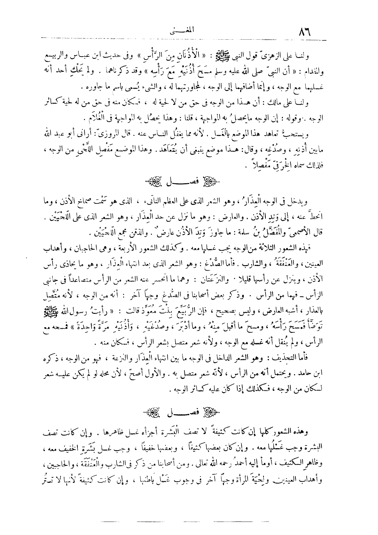 فَأَمَّا الصُّدْغُ، وَهُوَ الشَّعْرُ الَّذِي بَعْدُ انْتِهَاءِ الْعِذَارِ، وَهُوَ مَا يُحَاذِي رَأْسَ الْأُذُنِ وَيَنْزِلُ عَنْ رَأْسِهَا قَلِيلًا، وَالنَّزْعَتَانِ، وَهُمَا مَا انْحَسَرَ عَنْهُ الشَّعْرُ مِنْ الرَّأْسِ مُتَصَاعِدًا فِي جَانِبَيْ الرَّأْسِ، فَهُمَا مِنْ الرَّأْسِ. وَذَكَرَ بَعْضُ أَصْحَابِنَا فِي الصُّدْغِ وَجْهًا آخَرَ، أَنَّهُ مِنْ الْوَجْهِ؛ لِأَنَّهُ مُتَّصِلٌ بِالْعِذَارِ، أَشْبَهَ الْعَارِضَ، وَلَيْسَ بِصَحِيحٍ؛ فَإِنَّ الرُّبَيِّعَ بِنْتَ مُعَوِّذٍ قَالَتْ: «رَأَيْت رَسُولَ اللَّهِ - صَلَّى اللَّهُ عَلَيْهِ وَسَلَّمَ - تَوَضَّأَ فَمَسَحَ رَأْسَهُ، وَمَسَحَ مَا أَقْبَلَ مِنْهُ وَمَا أَدْبَرَ، وَصُدْغَيْهِ وَأُذُنَيْهِ، مَرَّةً وَاحِدَةً.» فَمَسَحَهُ مَعَ الرَّأْسِ، وَلَمْ يُنْقَلْ أَنَّهُ غَسَلَهُ مَعَ الْوَجْهِ؛ وَلِأَنَّهُ شَعْرٌ مُتَّصِلٌ بِشَعْرِ الرَّأْسِ لَا يَخْتَصُّ الْكَبِيرَ، فَكَانَ مِنْ الرَّأْسِ، كَسَائِرِ نَوَاحِيهِ، وَمَا ذَكَرَهُ مِنْ الْقِيَاسِ طَرْدِيٌّ لَا مَعْنَى تَحْتَهُ، وَلَيْسَ هُوَ أَوْلَى مِنْ قِيَاسِنَا. فَأَمَّا التَّحْذِيفُ، وَهُوَ الشَّعْرُ الدَّاخِلُ فِي الْوَجْهِ مَا بَيْنَ انْتِهَاءِ الْعِذَارِ وَالنَّزْعَةِ، فَهُوَ مِنْ الْوَجْهِ. ذَكَرَهُ ابْنُ حَامِدٍ.