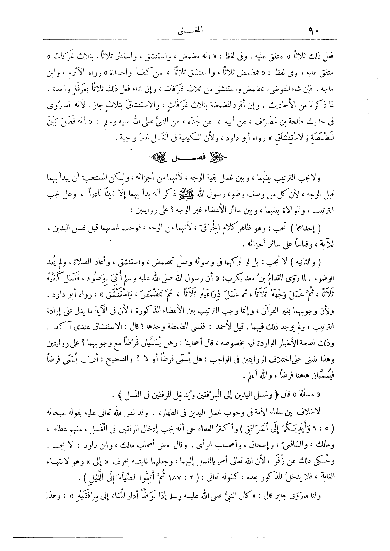 فَإِنْ شَاءَ الْمُتَوَضِّئُ تَمَضْمَضَ وَاسْتَنْشَقَ مِنْ ثَلَاثِ غَرَفَاتٍ، وَإِنْ شَاءَ فَعَلَ ذَلِكَ ثَلَاثًا بِغَرْفَةٍ وَاحِدَةٍ؛ لِمَا ذَكَرْنَا مِنْ الْأَحَادِيثِ. وَإِنْ أَفْرَدَ الْمَضْمَضَةَ بِثَلَاثِ غَرَفَاتٍ، وَالِاسْتِنْشَاقَ بِثَلَاثٍ، جَازَ؛ لِأَنَّهُ قَدْ رُوِيَ فِي حَدِيثِ طَلْحَةَ بْنِ مُصَرِّفٍ، عَنْ أَبِيهِ، عَنْ جَدِّهِ، عَنْ النَّبِيِّ - صَلَّى اللَّهُ عَلَيْهِ وَسَلَّمَ - «أَنَّهُ فَصَلَ بَيْنَ الْمَضْمَضَةِ وَالِاسْتِنْشَاقِ.» رَوَاهُ أَبُو دَاوُد؛ وَلِأَنَّ الْكَيْفِيَّةَ فِي الْغَسْلِ غَيْرُ وَاجِبَةٍ.