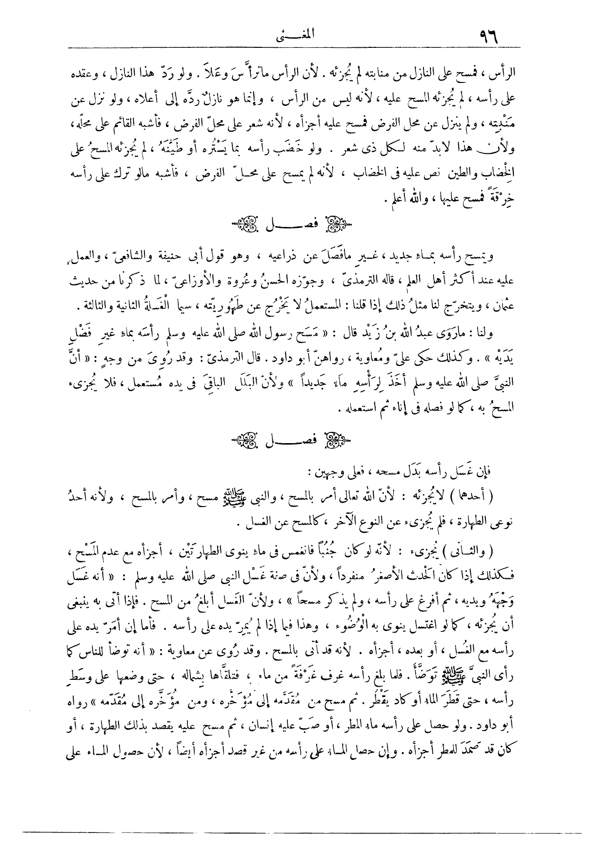 (١٧١) فَصْلٌ: وَيَمْسَحُ رَأْسَهُ بِمَاءٍ جَدِيدٍ غَيْرِ مَا فَضَلَ عَنْ ذِرَاعَيْهِ. وَهُوَ قَوْلُ أَبِي حَنِيفَةَ وَالشَّافِعِيِّ وَالْعَمَلُ عَلَيْهِ عِنْدَ أَكْثَرِ أَهْلِ الْعِلْمِ. قَالَهُ التِّرْمِذِيُّ. وَجَوَّزَهُ الْحَسَنُ وَعُرْوَةُ وَالْأَوْزَاعِيُّ لِمَا ذَكَرْنَا مِنْ حَدِيثِ عُثْمَانَ، وَيَتَخَرَّجُ لَنَا مِثْلُ ذَلِكَ إذَا قُلْنَا: إنَّ الْمُسْتَعْمَلَ لَا يَخْرُجُ عَنْ طُهُورِيَّتِهِ، سِيَّمَا الْغَسْلَةُ الثَّانِيَةُ وَالثَّالِثَةُ. وَلَنَا: مَا رَوَى عَبْدُ اللَّهِ بْنُ زَيْدٍ، قَالَ: «مَسَحَ رَسُولُ اللَّهِ - صَلَّى اللَّهُ عَلَيْهِ وَسَلَّمَ - رَأْسَهُ بِمَاءٍ غَيْرِ فَضْلِ يَدَيْهِ.» وَكَذَلِكَ حَكَى عَلِيٌّ وَمُعَاوِيَةُ رَوَاهُنَّ أَبُو دَاوُد، قَالَ التِّرْمِذِيُّ: وَقَدْ رُوِيَ مِنْ غَيْرِ وَجْهٍ، «أَنَّ النَّبِيَّ - صَلَّى اللَّهُ عَلَيْهِ وَسَلَّمَ - أَخَذَ لِرَأْسِهِ مَاءً جَدِيدًا.»